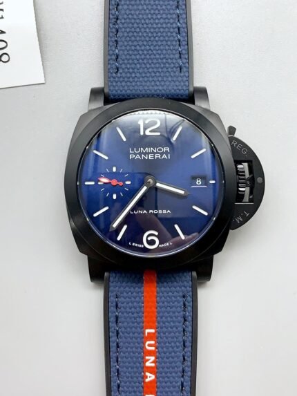 Panerai Luminor Marina Automatic Men’s Watch – Red Camo Rubber Strap, Rose Gold Case, 45mm — Premium 1:1 super clone. Case: 316L stainless steel cushion case, polished/brushed finish. Crystal: Genuine sapphire crystal with AR coating. Movement: Clone P.9010 automatic (28,800 bph, 3-day power reserve). 12-month movement warranty. Free worldwide shipping on orders over $1,200.