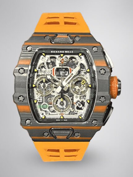 Swiss Replica Richard Mille RM 11-03 McLaren Watch – Carbon Fiber Skeleton Chronograph with Striking Orange Rubber Strap