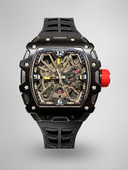 Swiss Replica Richard Mille RM 35-02 Watch For Men – Skeleton Dial, Yellow Rubber Strap, Luxury Sport Design — Premium 1:1 super clone. Case: Titanium / carbon composite tonneau case. Crystal: Genuine sapphire crystal front and back. Movement: Clone RM caliber (skeletonized automatic). 12-month movement warranty. Free worldwide shipping on orders over $1,200.