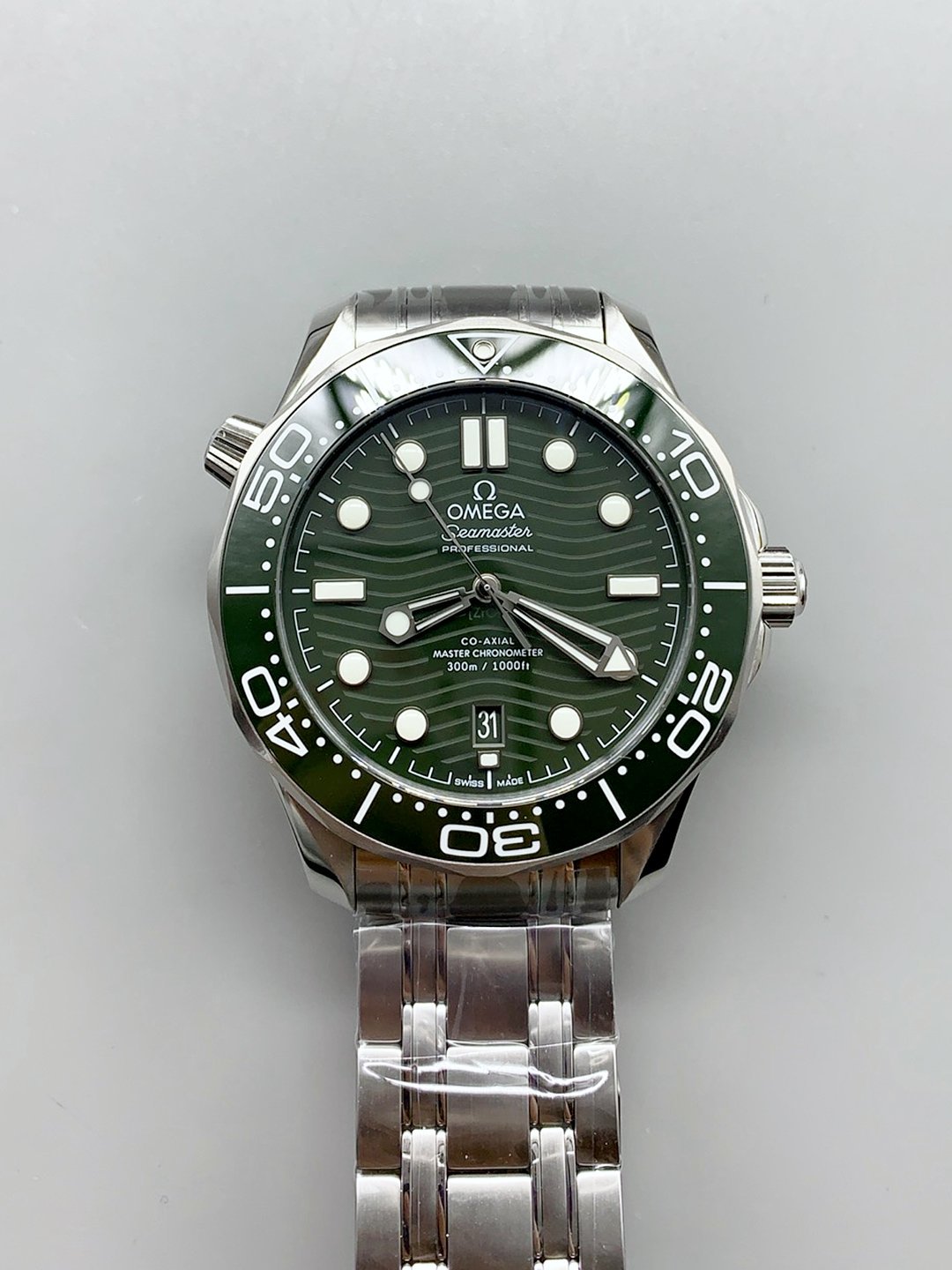 OMEGA Seamaster Diver 300M 42mm Green Dial is a high-quality 1:1 Superclone watch that is very close to the original. It has a 42mm stainless steel case. a silver ceramic bezel. a Green dial with wave pattern. and a date window at 6 o’clock. The watch is powered by a Swiss Eta automatic movement that is decorated to look like the Omega Co-Axial Master Chronometer movement. The watch also has a sapphire crystal and a water resistance of 300 meters.