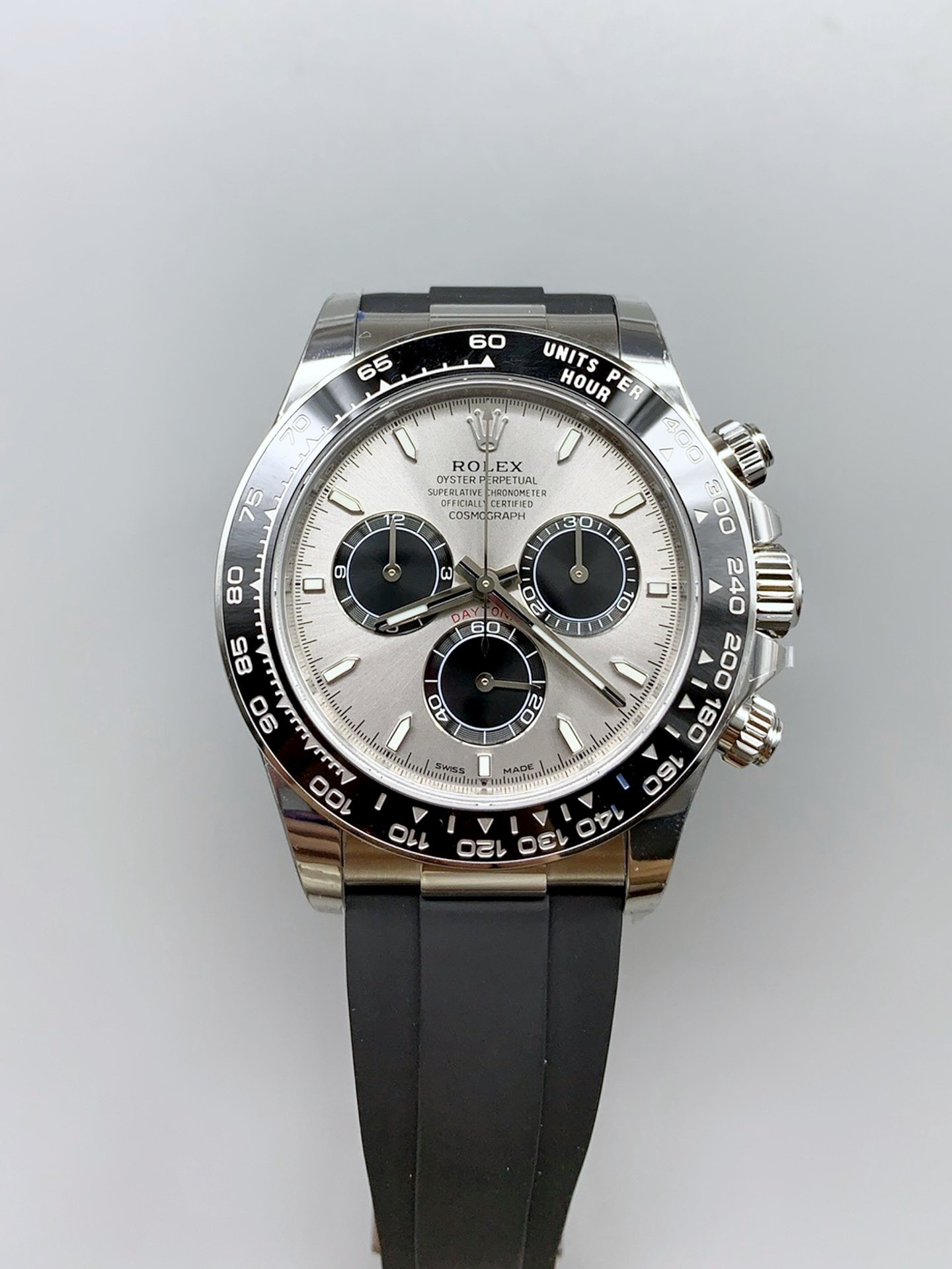 The Rolex Daytona 116519 1:1 Superclone quality with a silver dial and rubber strap. It is a 40mm watch that is made of white gold polished on 904L stainless steel. The dial is silver with black subdials and features Chroma Light lume. The watch is powered by the Rolex calibre 4130 automatic movement. It has a water resistance of 60 meters.