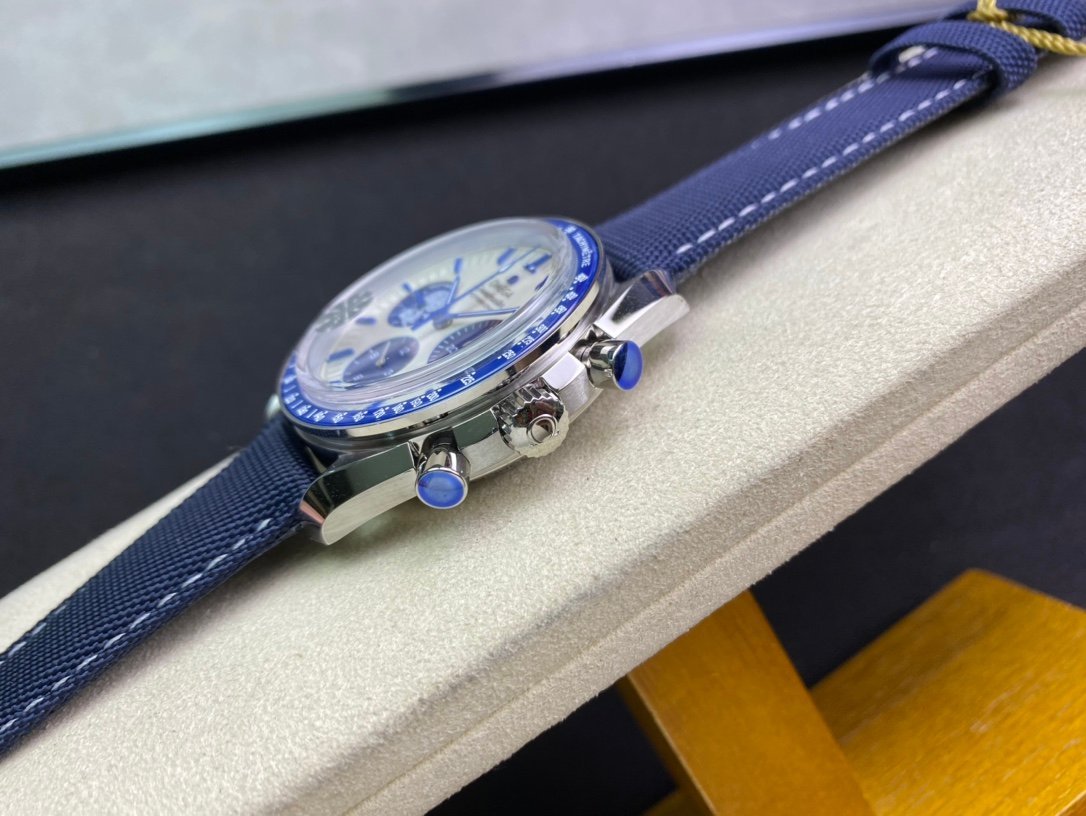 这款欧米茄史努比150周年纪念腕表,配备表带,是对原版腕表的1:1完美复刻。它采用42毫米精钢表壳,黑色表盘上饰有蓝色史努比飞翔于云间的图案,6点钟位置设有日期显示窗口。腕表搭载瑞士ETA 3861自动上链机芯,并配有黑色皮革表带,饰以白色对比缝线。