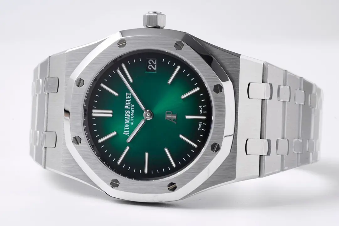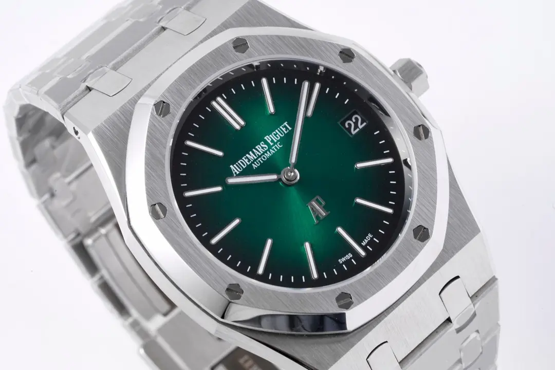 Audemars Piguet Royal Oak 15202 Green Steel — Premium 1:1 super clone. Case: 904L stainless steel case and integrated bracelet. Crystal: Genuine sapphire crystal with AR coating. Movement: Clone AP caliber (mechanical automatic). 12-month movement warranty. Free worldwide shipping on orders over $1,200.
