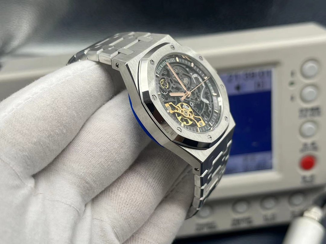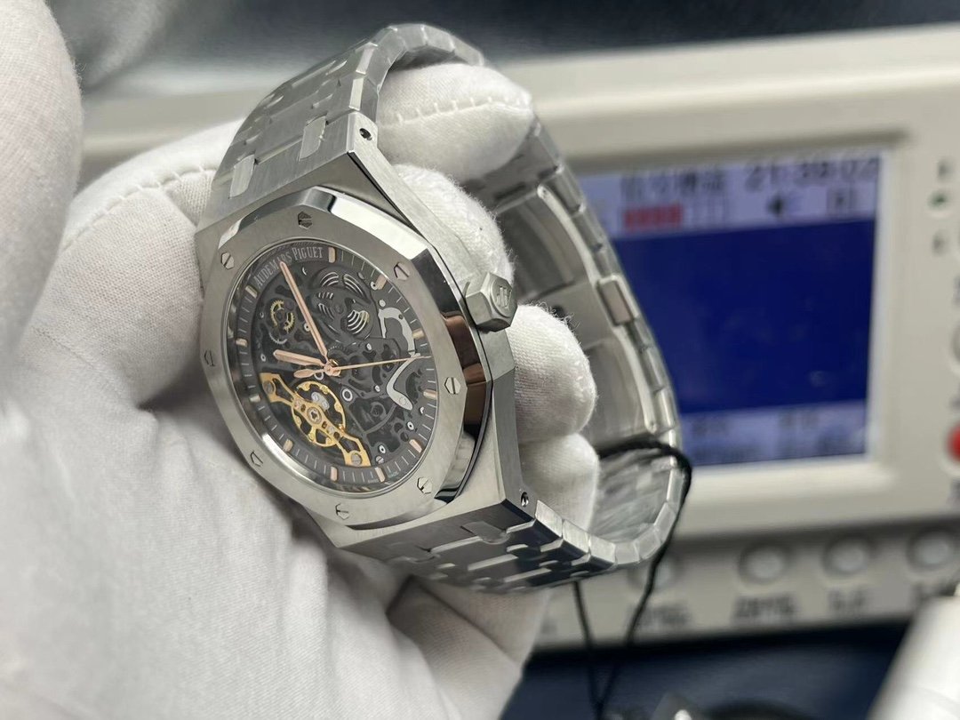 Audemars Piguet Royal Oak 15407 41mm — Premium 1:1 super clone. Case: 904L stainless steel case and integrated bracelet. Crystal: Genuine sapphire crystal with AR coating. Movement: Clone AP caliber (mechanical automatic). 12-month movement warranty. Free worldwide shipping on orders over $1,200.