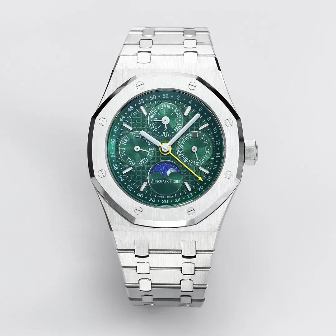 Audemars Piguet Royal Oak Perpetual Calendar Blue Dial Stainless Steel — Premium 1:1 super clone. Case: 904L stainless steel case and integrated bracelet. Crystal: Genuine sapphire crystal with AR coating. Movement: Clone AP caliber (mechanical automatic). 12-month movement warranty. Free worldwide shipping on orders over $1,200.