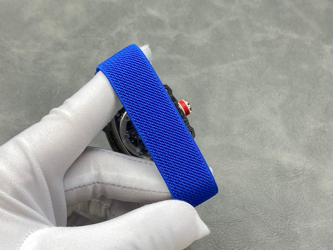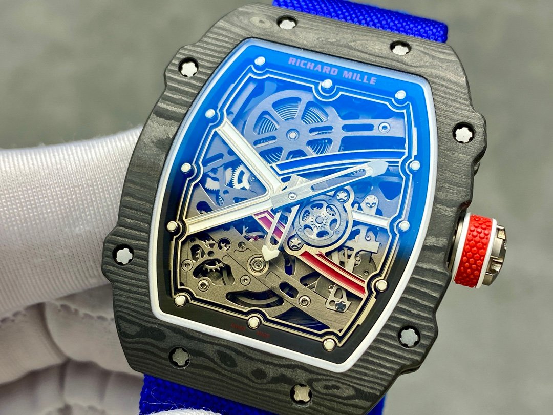The Richard Mille RM 67-02 Replica is a perfect combination of elegance and cutting-edge performance. The 47mm Carbon TPT case houses a stunning skeletonized dial that shows the intricate Swiss movement inside, evidence of Richard Mille’s technical expertise. Made for high-performance activities, this light and tough timepiece combines leading-edge materials with exceptional craftsmanship. The bright blue nylon strap assures comfort and style, while the sapphire crystal and 50 meters water resistance increase its reliability. With its status as a limited-edition super clone, this AAA-grade watch just exudes precision and aesthetics for any person who seeks luxury and sophistication.