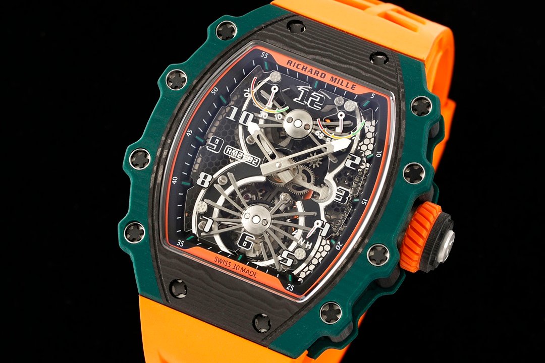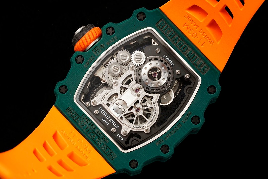 Best Richard Mille RM 21-02 Tourbillon Aerodyne Replica Watch – Orange Leather Strap — Premium 1:1 super clone. Case: Titanium / carbon composite tonneau case. Crystal: Genuine sapphire crystal front and back. Movement: Clone RM caliber (skeletonized automatic). 12-month movement warranty. Free worldwide shipping on orders over $1,200.