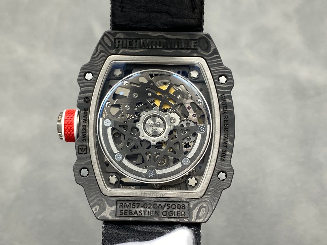 The RM67-02 V4 has a solid case back that adds an aesthetic touch to the elegance of its openwork design. A sapphire crystal glass gives this Swiss replica clarity and water resistance up to 50 meters, as practical as it is luxurious. This is the best AAA quality Richard Mille replica for collectors and enthusiasts alike.