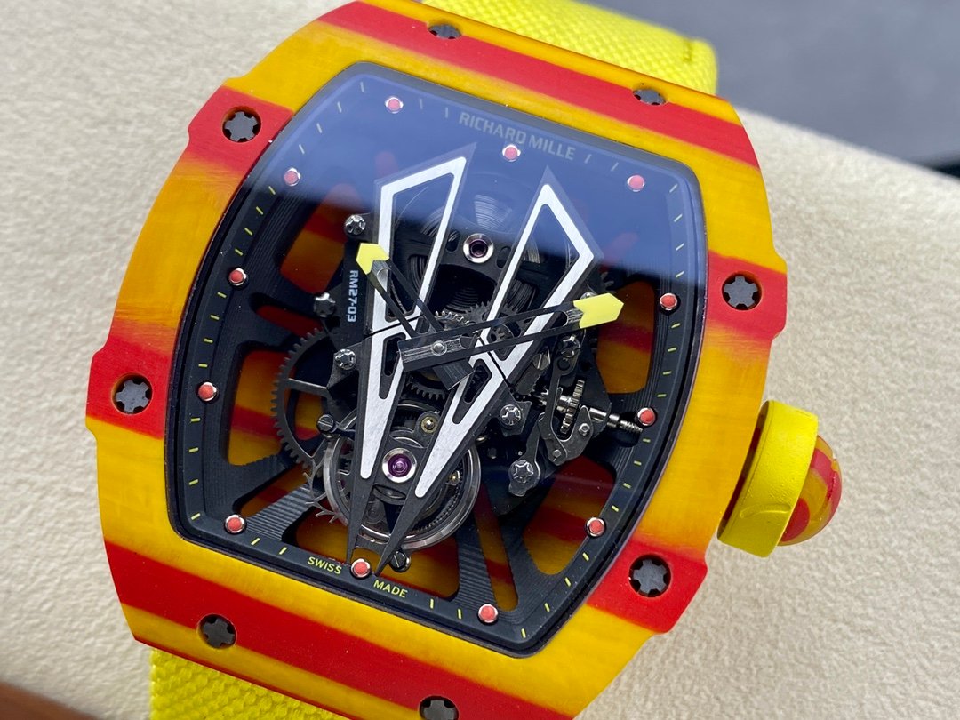 Best Swiss Replica Richard Mille RM 27-03 Red Yellow Carbon Fiber Watch — Premium 1:1 super clone. Case: Titanium / carbon composite tonneau case. Crystal: Genuine sapphire crystal front and back. Movement: Clone RM caliber (skeletonized automatic). 12-month movement warranty. Free worldwide shipping on orders over $1,200.