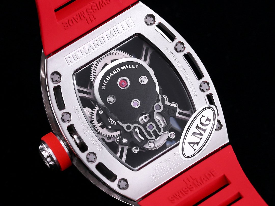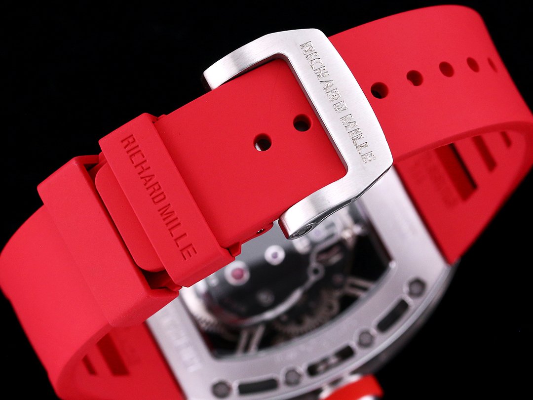 Best Swiss Replica RICHARD MILLE RM 52 Tourbillon Super Clone Watch – Skull Skeleton Dial, Red Strap — Premium 1:1 super clone. Case: Titanium / carbon composite tonneau case. Crystal: Genuine sapphire crystal front and back. Movement: Clone RM caliber (skeletonized automatic). 12-month movement warranty. Free worldwide shipping on orders over $1,200.