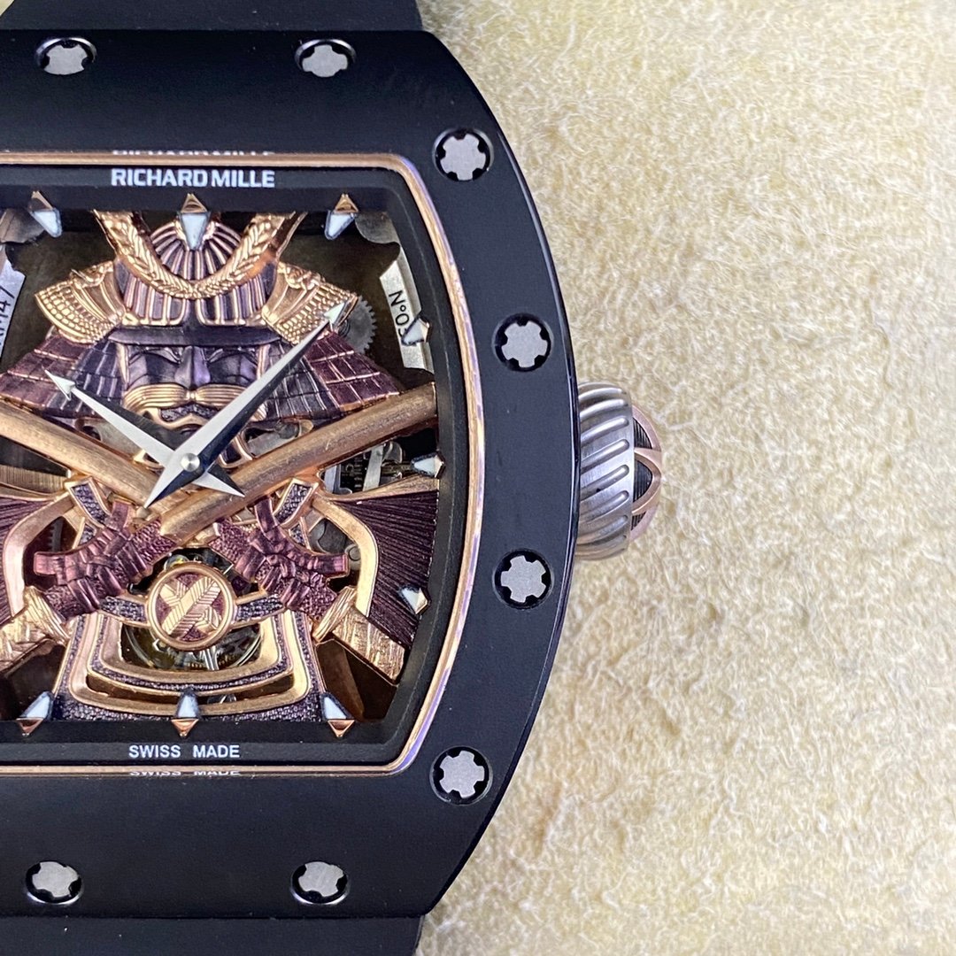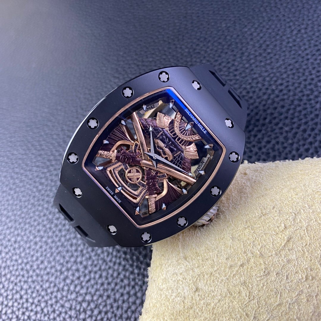 Experience the unparalleled craftsmanship of the Best Swiss RM47 Black Samurai Tourbillon Replica Watch. With a bold 43mm ceramic case, this watch exudes durability and sophistication. The intricate skeleton dial showcases a stunning Samurai armor motif, reflecting fine engraving and remarkable attention to detail. Equipped with a Swiss movement, it delivers precision and reliability, while the black rubber strap ensures a sporty yet comfortable fit.
