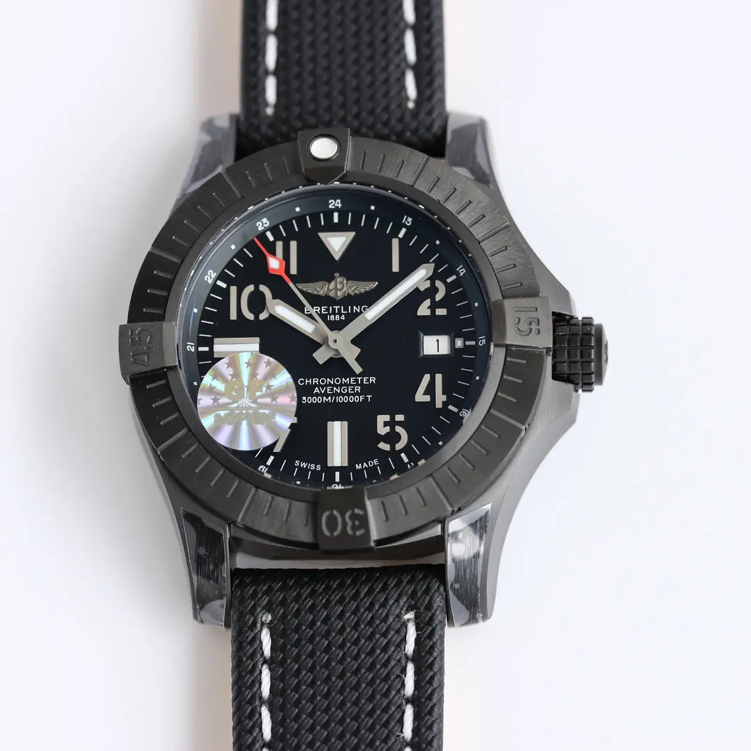 Breitling Avenger Automatic 45 Seawolf Black — Premium 1:1 super clone. Case: 316L stainless steel case, brushed and polished finish. Crystal: Genuine sapphire crystal with AR coating. Movement: Swiss ETA movement (automatic). 12-month movement warranty. Free worldwide shipping on orders over $1,200.