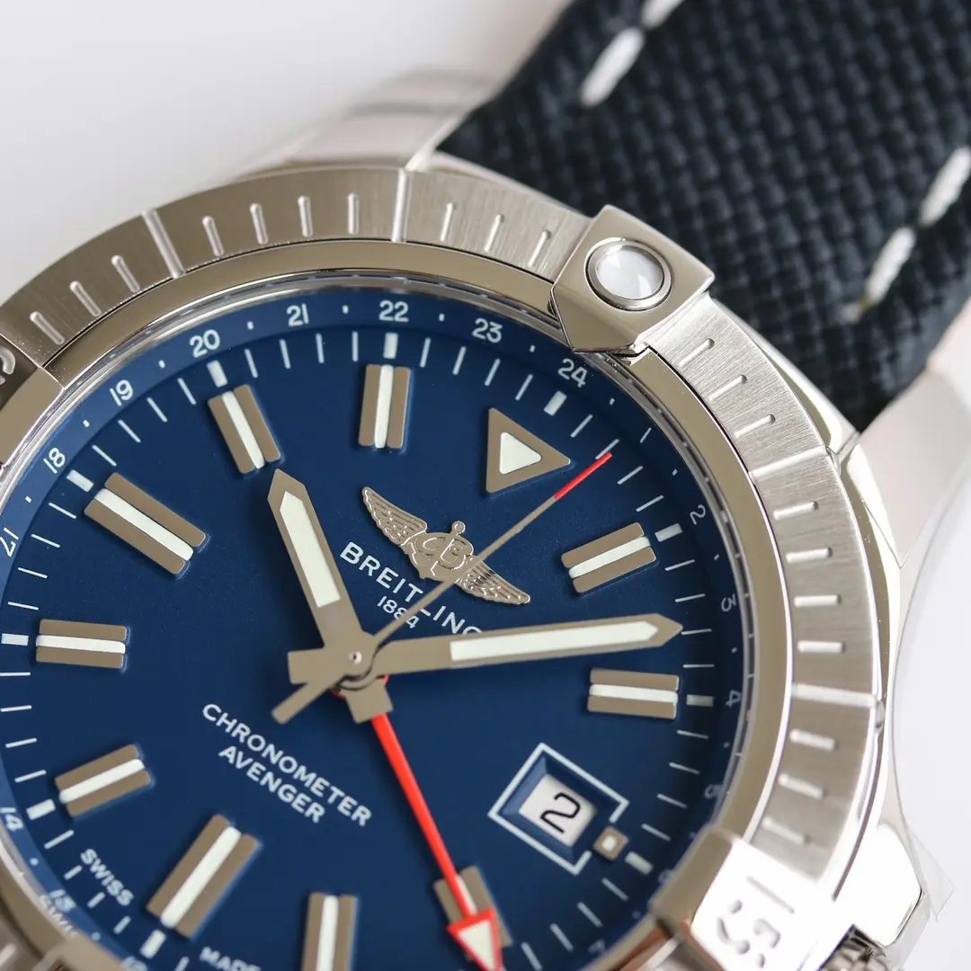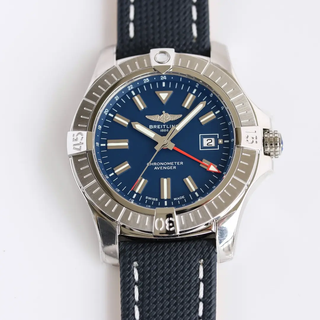 Breitling Avenger Automatic GMT 45 Blue — Premium 1:1 super clone. Case: 316L stainless steel case, brushed and polished finish. Crystal: Genuine sapphire crystal with AR coating. Movement: Swiss ETA movement (automatic). 12-month movement warranty. Free worldwide shipping on orders over $1,200.