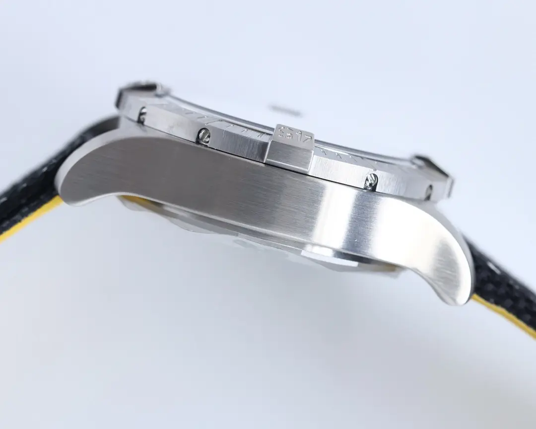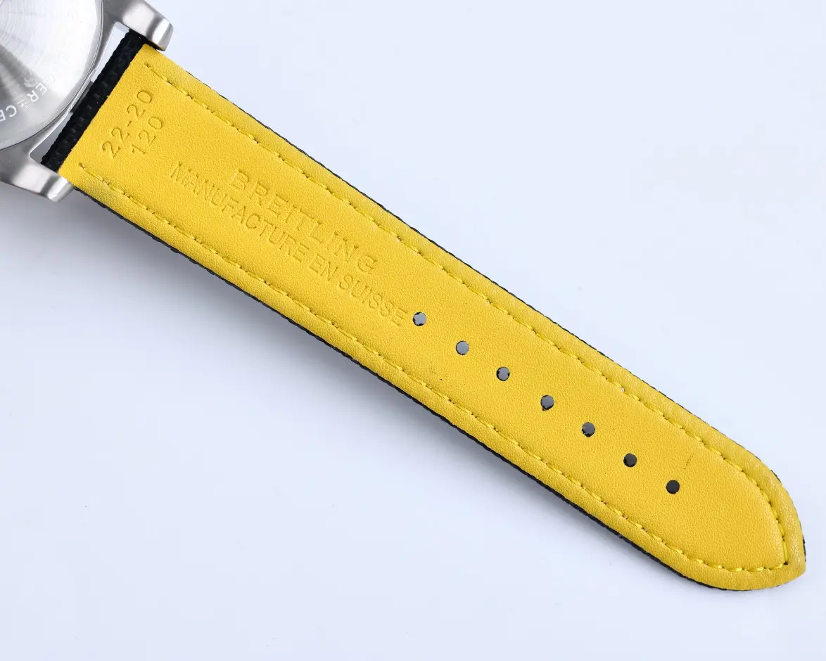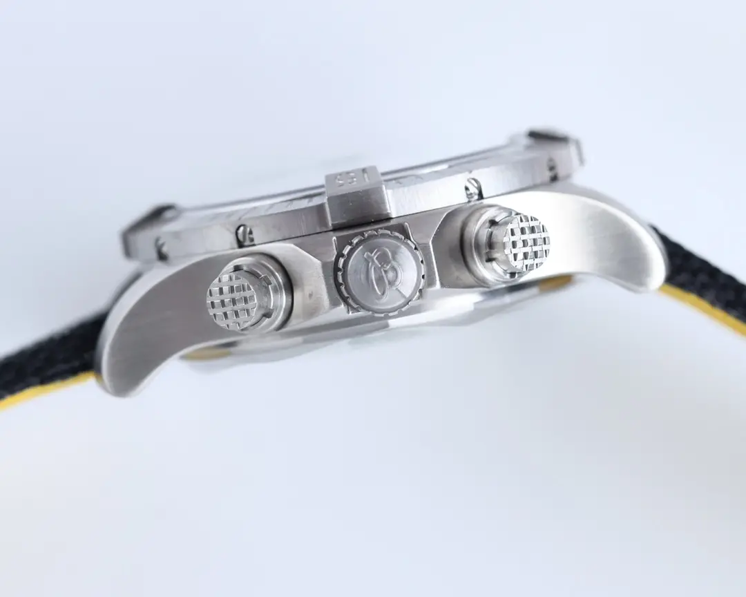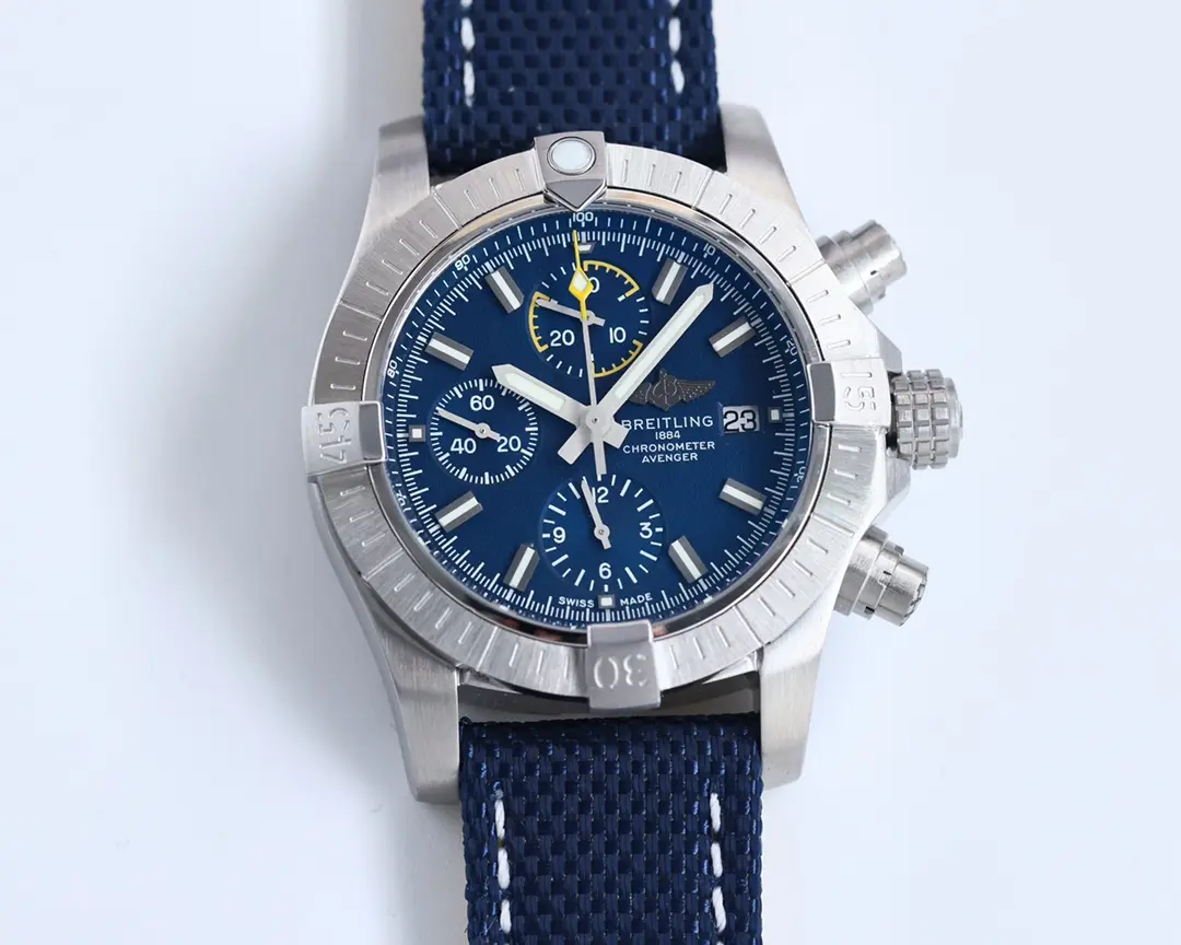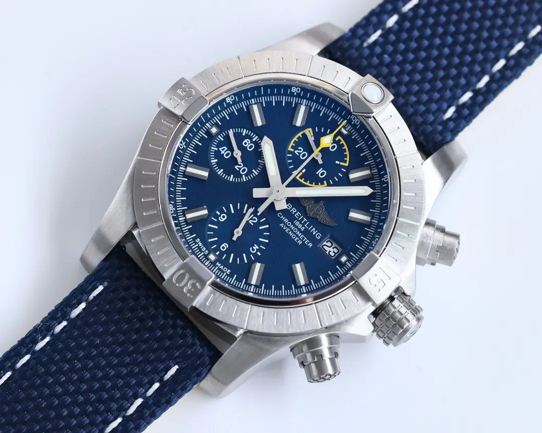 Breitling Avenger Chronograph 43 Blue Fabric — Premium 1:1 super clone. Case: 316L stainless steel case, brushed and polished finish. Crystal: Genuine sapphire crystal with AR coating. Movement: Swiss ETA movement (automatic). 12-month movement warranty. Free worldwide shipping on orders over $1,200.