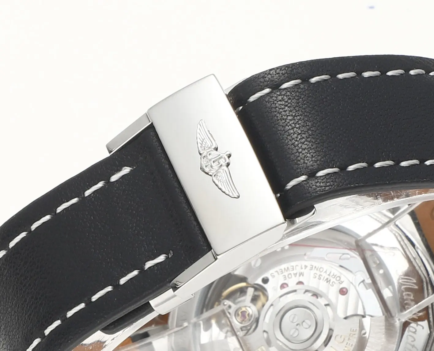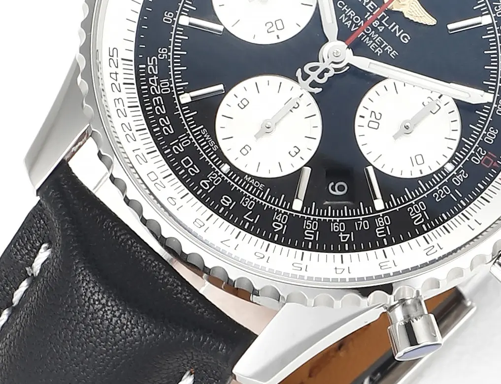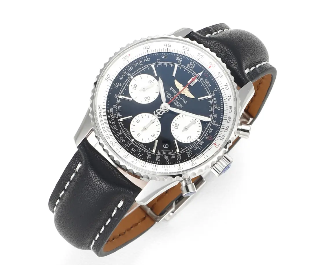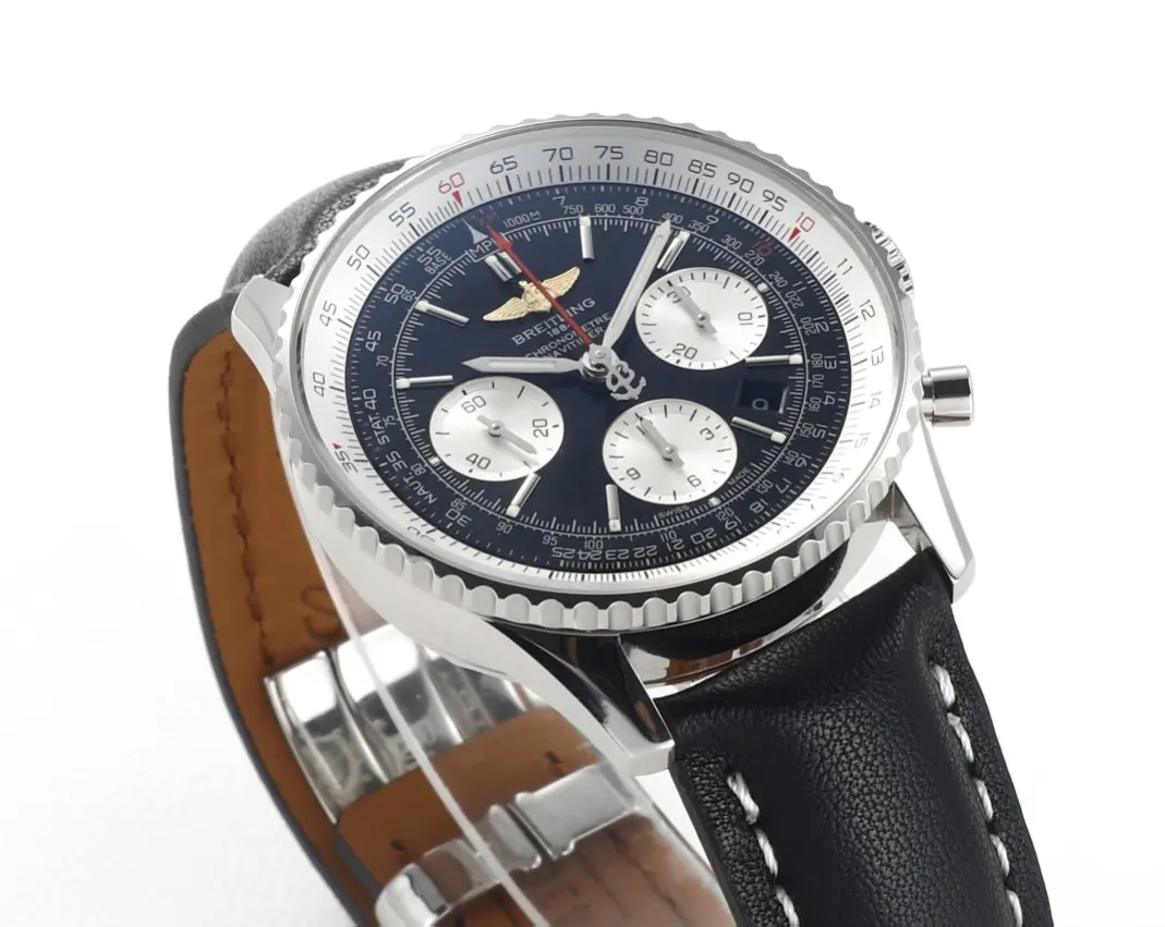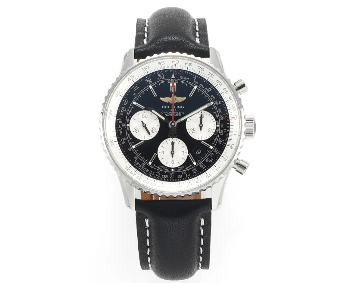 Breitling Navitimer 1 B01 Chronograph Black Leather — Premium 1:1 super clone. Case: 316L stainless steel case, brushed and polished finish. Crystal: Genuine sapphire crystal with AR coating. Movement: Swiss ETA 7750 column-wheel chronograph (28,800 bph). 12-month movement warranty. Free worldwide shipping on orders over $1,200.