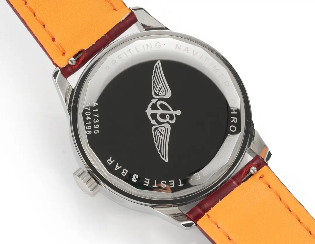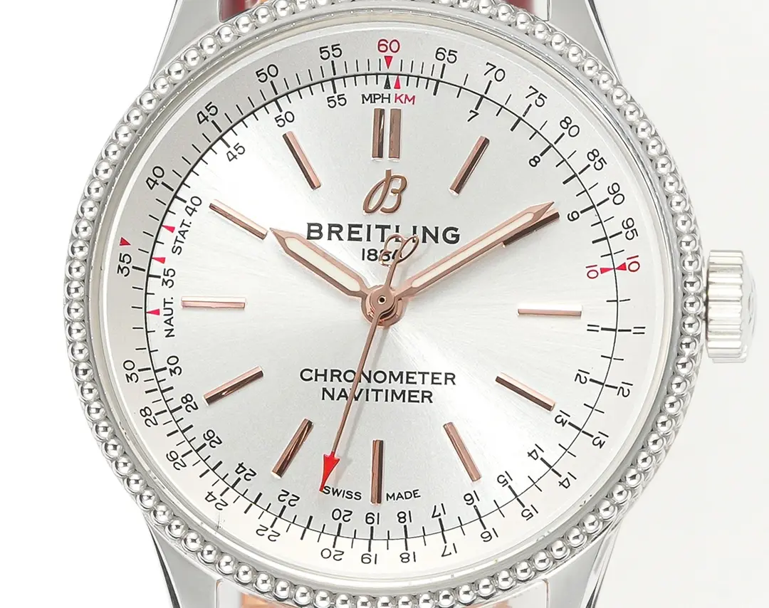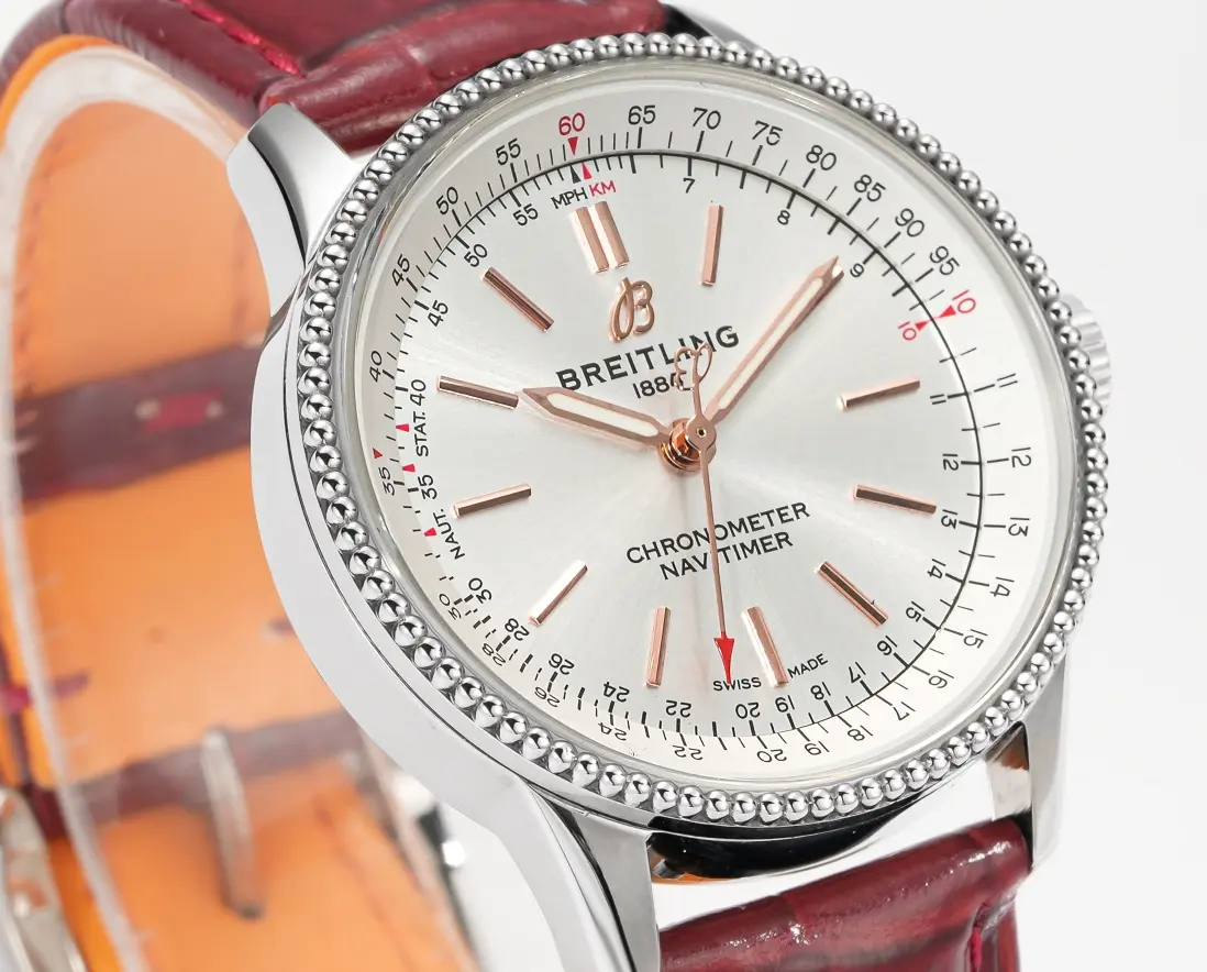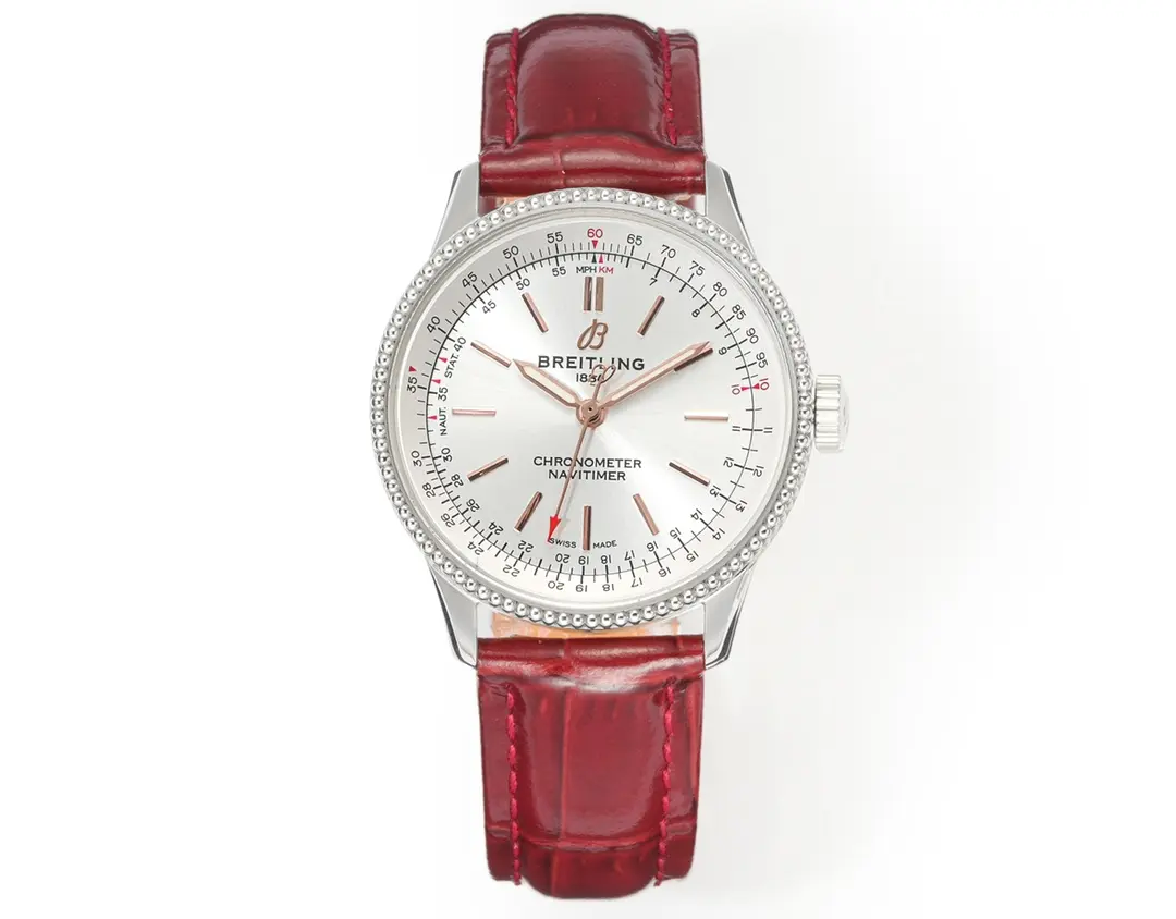 Breitling Navitimer Automatic Silver Red Leather — Premium 1:1 super clone. Case: 316L stainless steel case, brushed and polished finish. Crystal: Genuine sapphire crystal with AR coating. Movement: Swiss ETA 7750 column-wheel chronograph (28,800 bph). 12-month movement warranty. Free worldwide shipping on orders over $1,200.