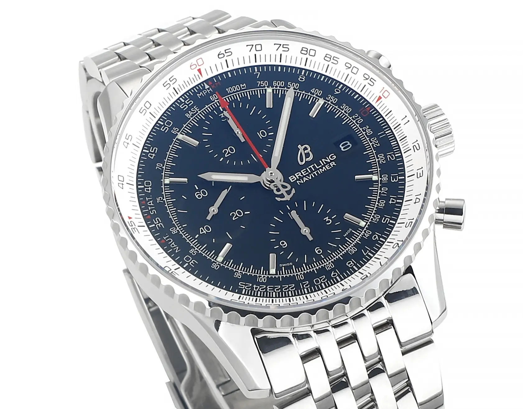 Breitling Navitimer Chronograph Blue Dial Steel — Premium 1:1 super clone. Case: 316L stainless steel case, brushed and polished finish. Crystal: Genuine sapphire crystal with AR coating. Movement: Swiss ETA 7750 column-wheel chronograph (28,800 bph). 12-month movement warranty. Free worldwide shipping on orders over $1,200.