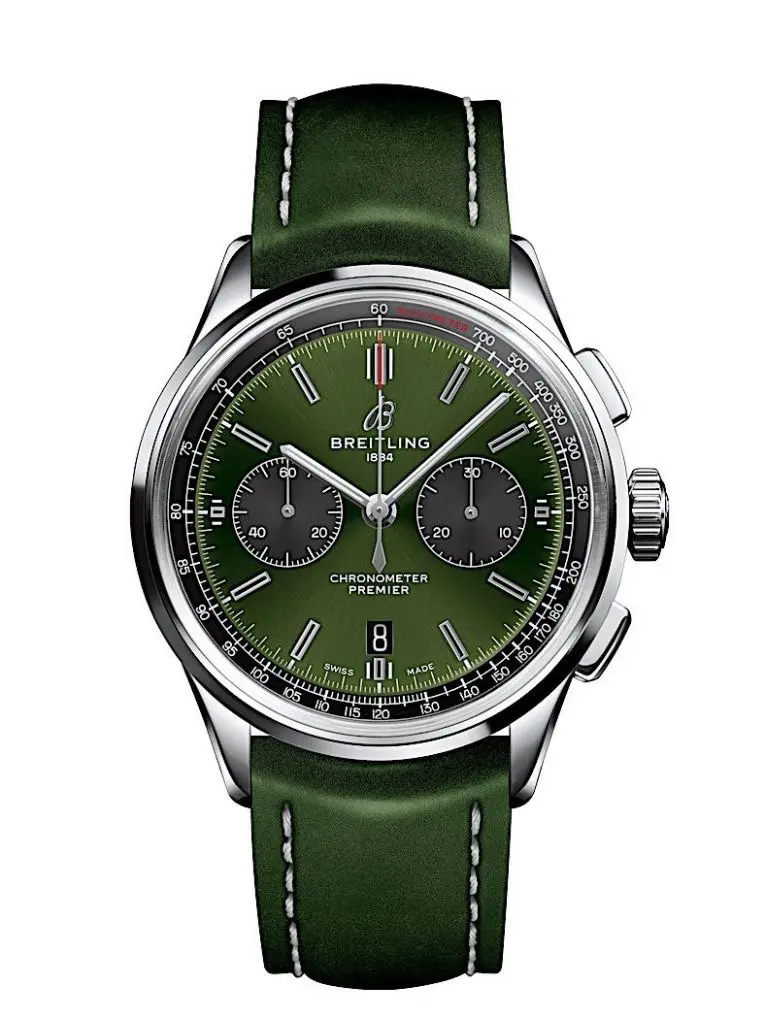 Breitling Premier B01 Chronograph Green Leather — Premium 1:1 super clone. Case: 316L stainless steel case, brushed and polished finish. Crystal: Genuine sapphire crystal with AR coating. Movement: Swiss ETA movement (automatic). 12-month movement warranty. Free worldwide shipping on orders over $1,200.