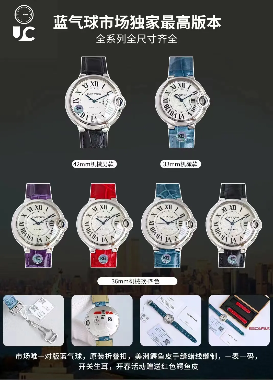 Cartier Ballon Bleu 33mm Blue Leather Watch – High-Quality Cartier — Premium 1:1 super clone. Case: Stainless steel case, silver-brushed or yellow gold PVD finish. Crystal: Genuine sapphire crystal with AR coating. Movement: Clone Cal. 1847 MC automatic. 12-month movement warranty. Free worldwide shipping on orders over $1,200.