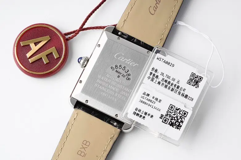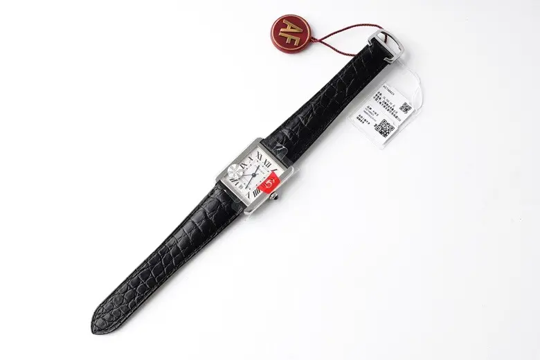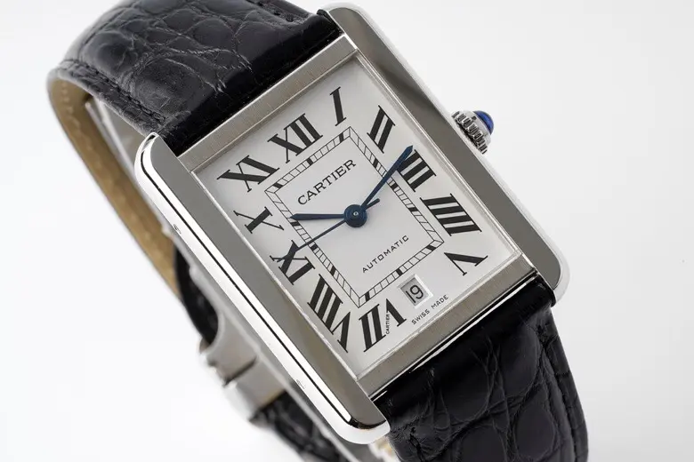 Cartier Tank W5200028 Silver Dial Black Leather — Premium 1:1 super clone. Case: Stainless steel case, silver-brushed or yellow gold PVD finish. Crystal: Genuine sapphire crystal with AR coating. Movement: Clone Cal. 430 MC (quartz or ETA 2824 automatic). 12-month movement warranty. Free worldwide shipping on orders over $1,200.