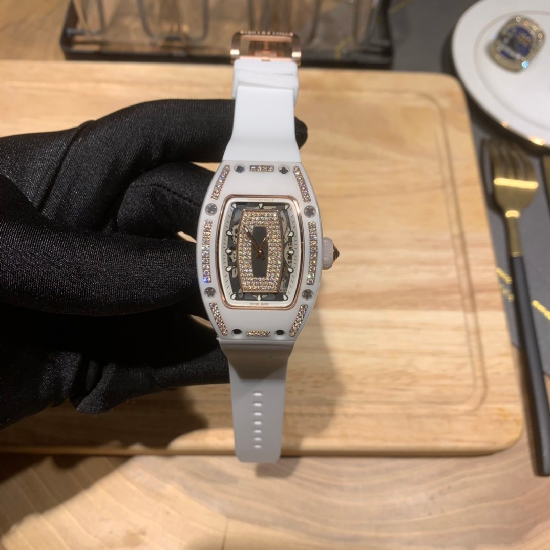 Elegant Swiss Richard Mille RM 07-01 Replica White Ceramic & Rose Gold Diamond Dial Watch – Luxury Style For Women — Premium 1:1 super clone. Case: Titanium / carbon composite tonneau case. Crystal: Genuine sapphire crystal front and back. Movement: Clone RM caliber (skeletonized automatic). 12-month movement warranty. Free worldwide shipping on orders over $1,200.