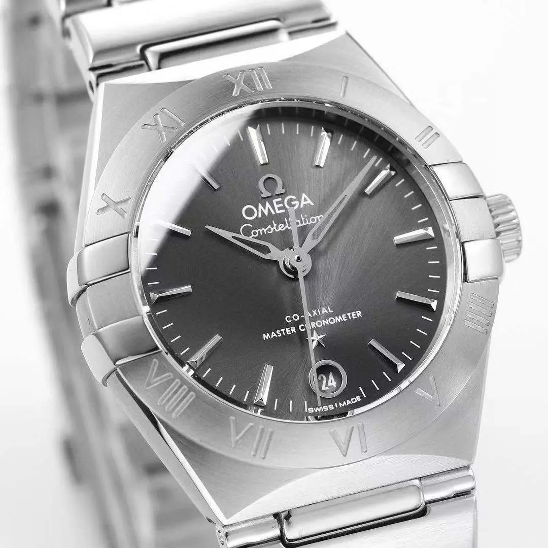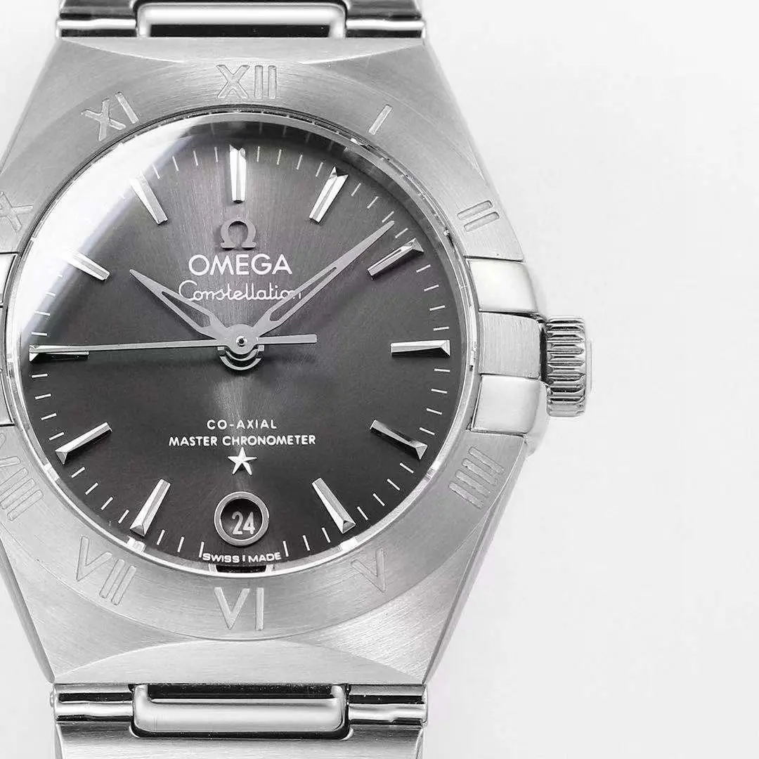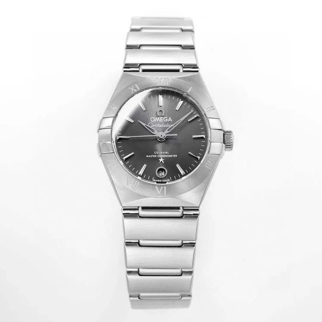 Omega Constellation 29mm Grey Dial Steel — Premium 1:1 super clone. Case: 316L stainless steel case with brushed/polished finish. Crystal: Genuine sapphire crystal with AR coating. Movement: Swiss ETA 2824-2 (28,800 bph, date). 12-month movement warranty. Free worldwide shipping on orders over $1,200.