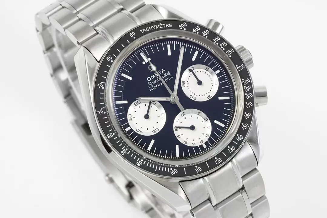 Omega Speedmaster 9300 Blue Dial Steel — Premium 1:1 super clone. Case: 316L stainless steel case with brushed/polished finish. Crystal: Genuine sapphire crystal with AR coating. Movement: Clone Cal. 3861 manual-wind chronograph or ETA 7750. 12-month movement warranty. Free worldwide shipping on orders over $1,200.