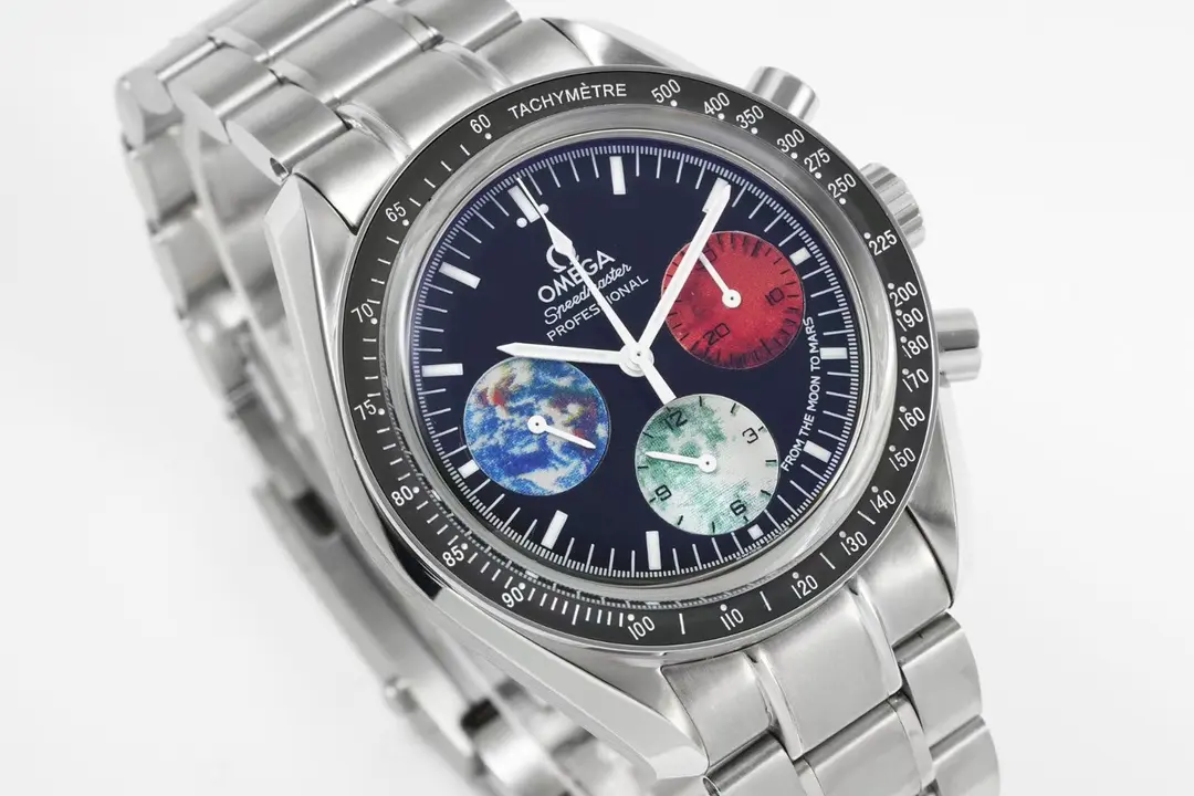 Omega Speedmaster 9300 Blue Red White Dial — Premium 1:1 super clone. Case: 316L stainless steel case with brushed/polished finish. Crystal: Genuine sapphire crystal with AR coating. Movement: Clone Cal. 3861 manual-wind chronograph or ETA 7750. 12-month movement warranty. Free worldwide shipping on orders over $1,200.