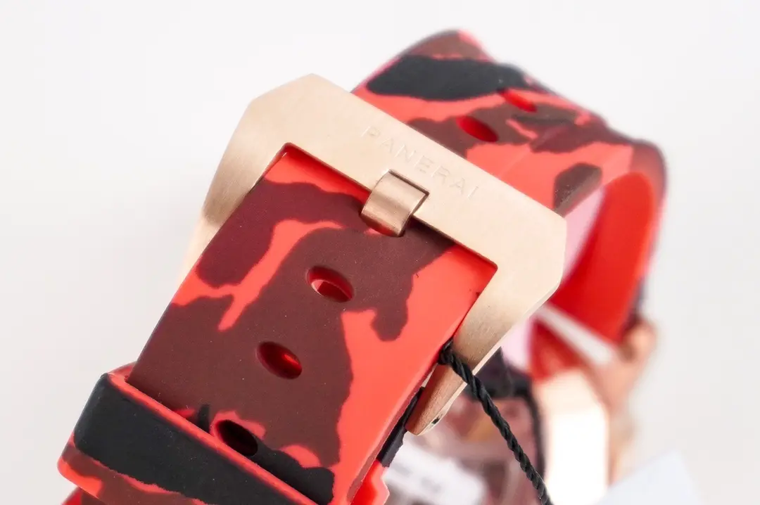Panerai Luminor Marina Automatic Men’s Watch – Red Camo Rubber Strap, Rose Gold Case, 45mm — Premium 1:1 super clone. Case: 316L stainless steel cushion case, polished/brushed finish. Crystal: Genuine sapphire crystal with AR coating. Movement: Clone P.9010 automatic (28,800 bph, 3-day power reserve). 12-month movement warranty. Free worldwide shipping on orders over $1,200.