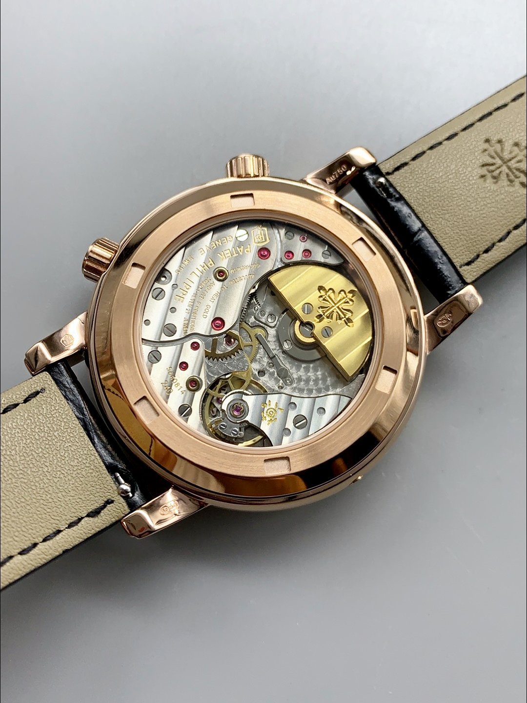 Genuine Swiss 9015 Movement assembled to Resemble the Authentic Patek Philippe PP 324 Calibre Style Movement. Updated Rotor, Bridged and Engravings on Movement with Rose Gold Plated Patek Philippe Stamped Rotor