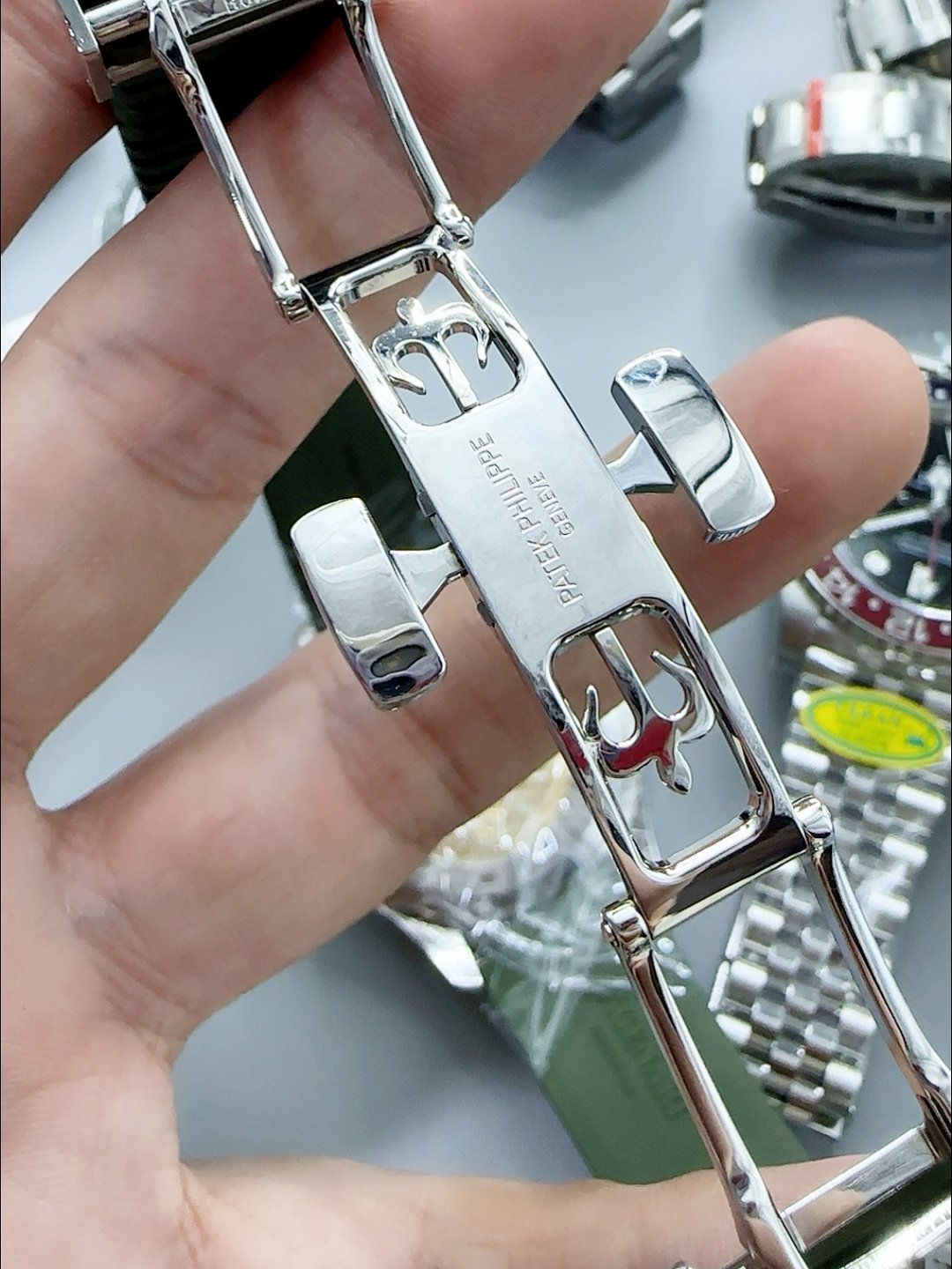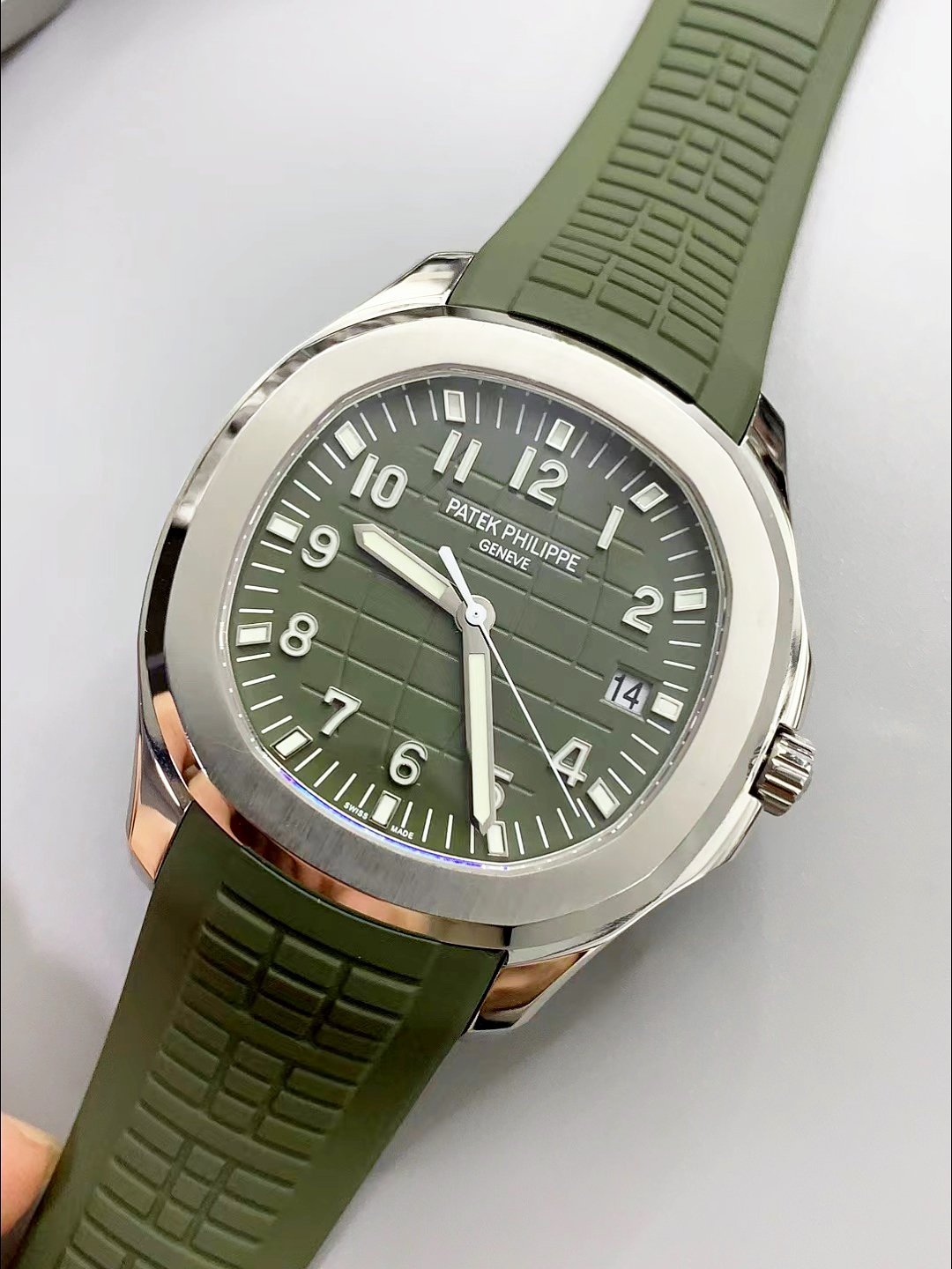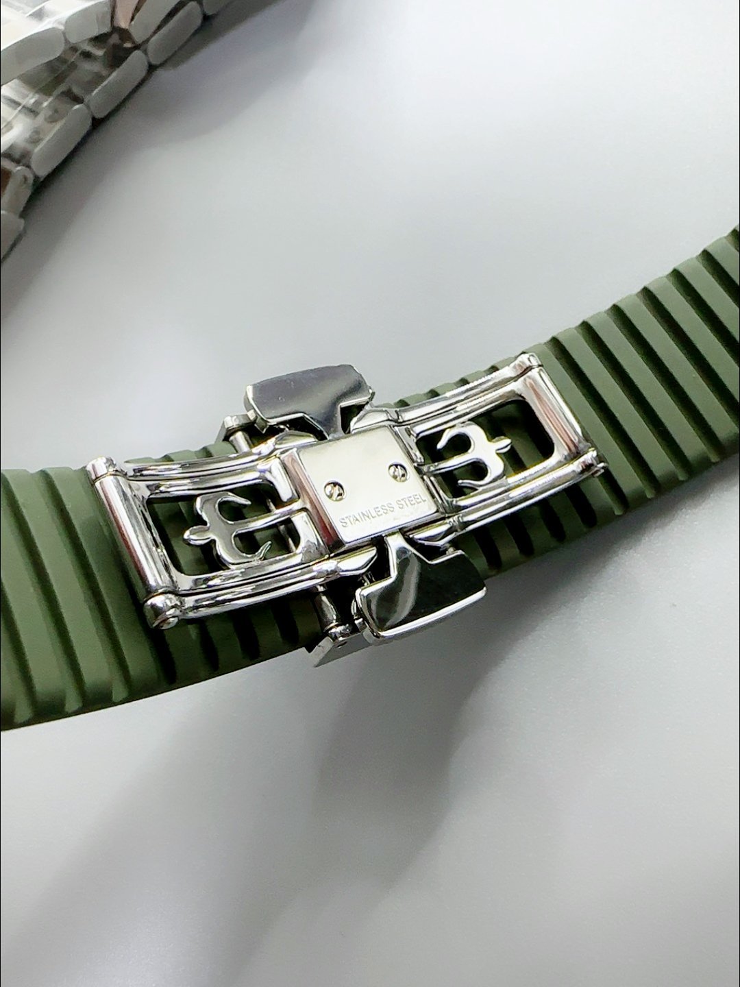 Green Curved Rubber Strap with Steel Folding Clasp complete with Patek Philippe Markings. A Highly Updated Clasps for this series with much more accurate markings/engravings.