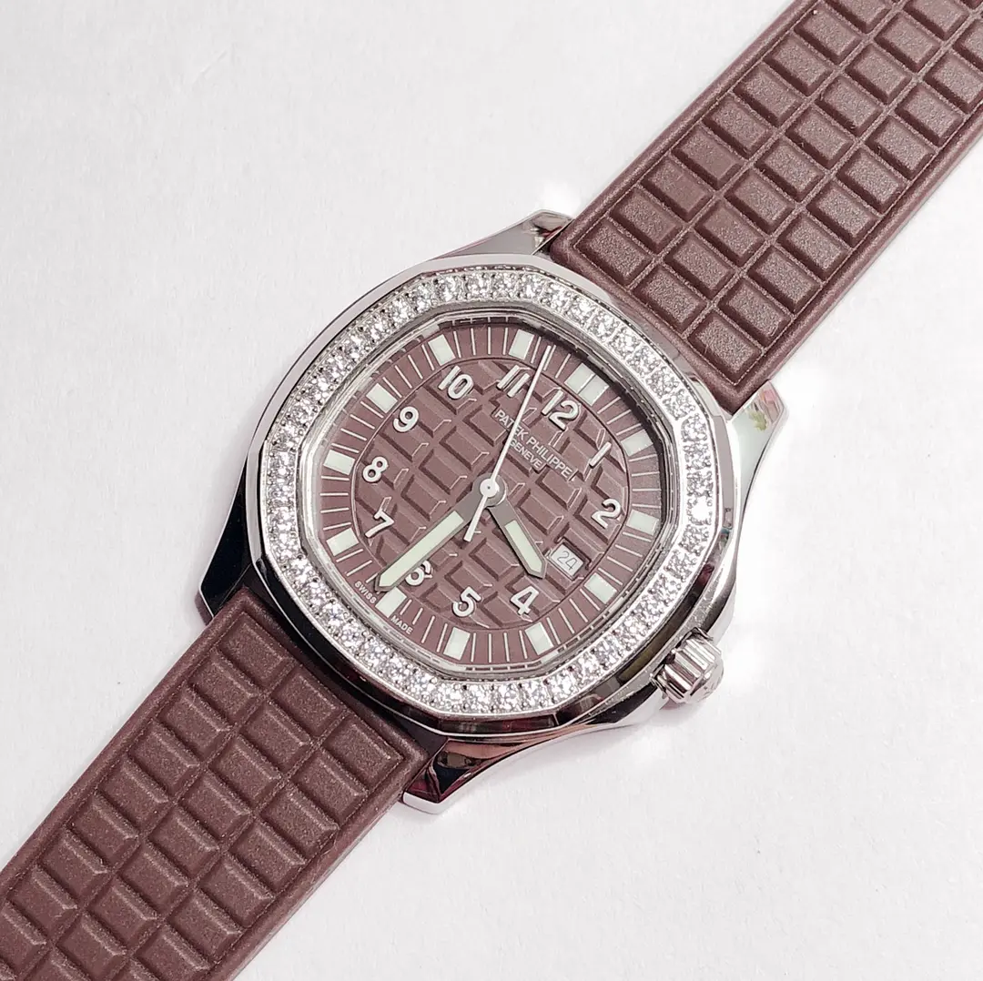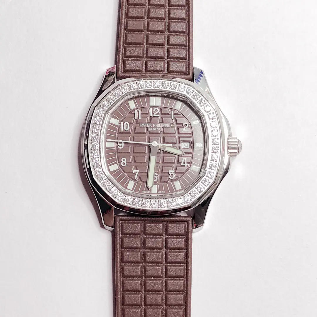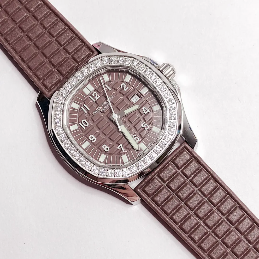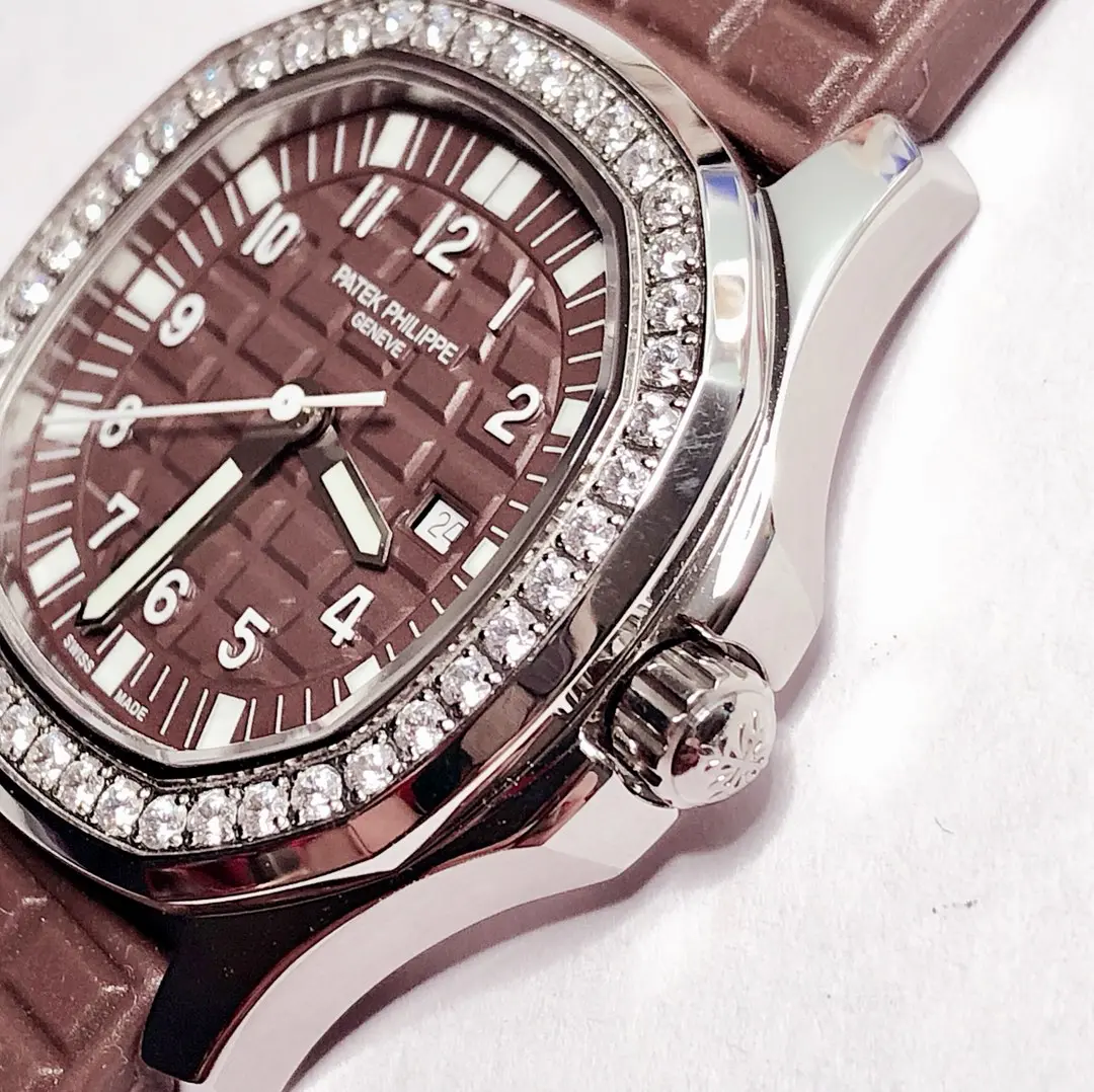 - Quartz Movement Quartz movement provides accurate timekeeping with minimal maintenance. Genuine Swarovski Crystals adorn the Diamond Bezel. The watch is given a luxurious touch. The Date Display Window is a practical feature that displays both the time and date. Tropical Composite Strap This strap is made from a durable composite material. Super-LumiNova Hands: The hands are covered in Super-LumiNova for enhanced visibility when it is dark. Patek Philippe Aquanaut Ladies Watch combines elegance and functionality. The luxurious watch is ideal for any occasion. This timepiece is distinguished by its stainless steel case with brown composite strap and is a perfect example of.