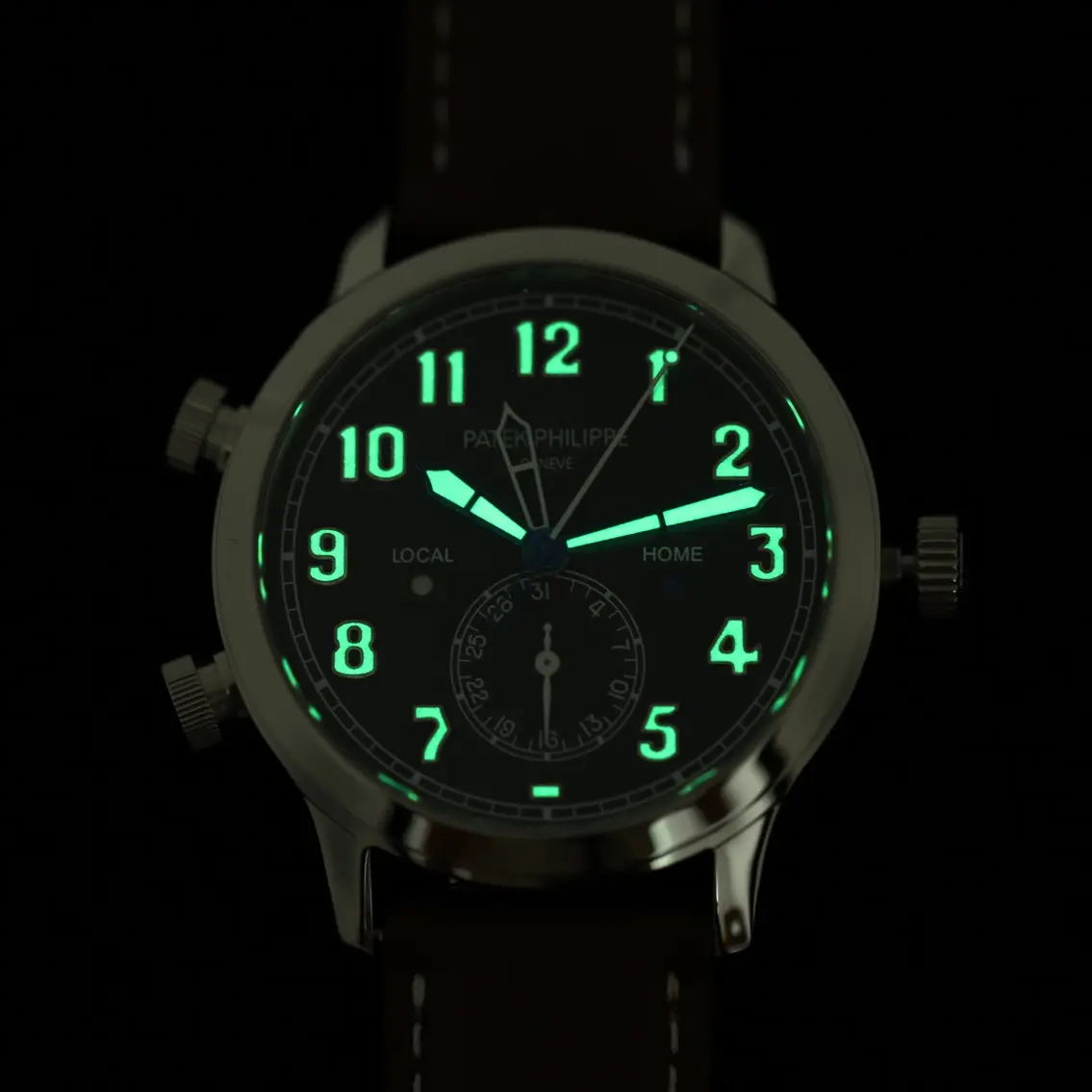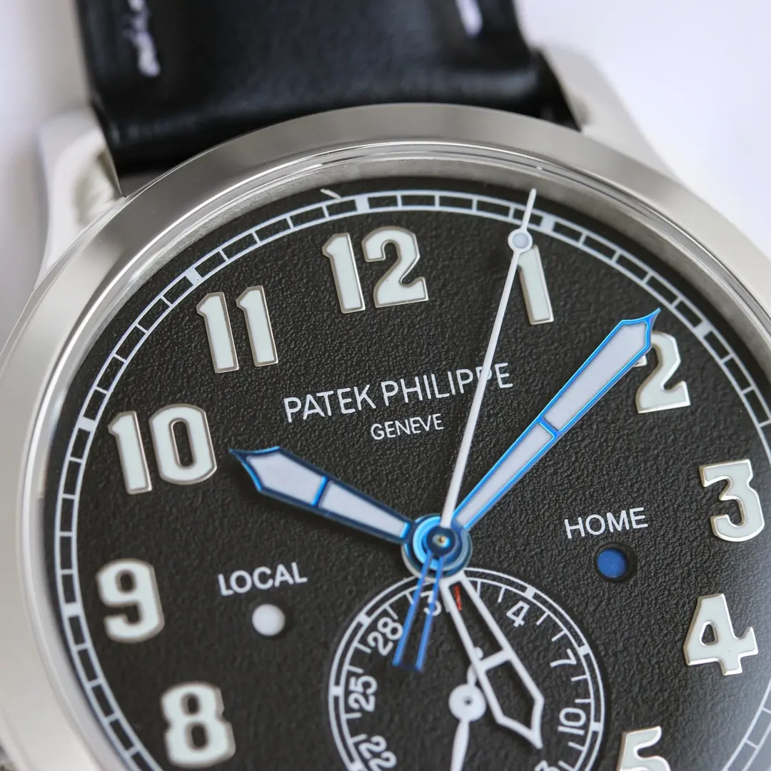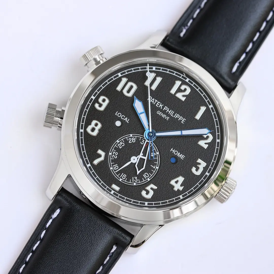 Patek Philippe Calatrava Pilot Travel Time Black Dial — Premium 1:1 super clone. Case: 904L stainless steel or 18k gold case. Crystal: Genuine sapphire crystal with AR coating. Movement: Clone Cal. 240 (ultra-thin, 19,800 bph). 12-month movement warranty. Free worldwide shipping on orders over $1,200.