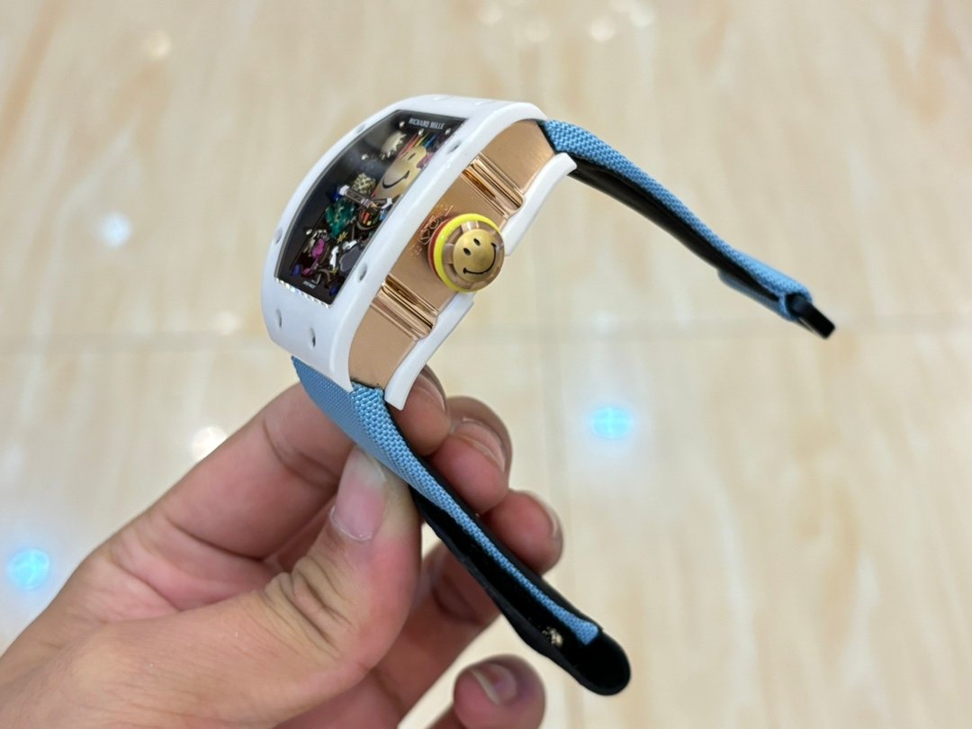 The Replica RM 88 Automatic Winding Tourbillon Smiley is a masterpiece of craftsmanship and design. Featuring the unique yellow gold Smiley figure, meticulously micro-blasted and painted, it sits atop a motion-work bridge made of micro-blasted ARCAP with polished anglage and drawn edges. The rainbow motif shines with faint reflections, enhanced by hand-applied varnishes, while the anthracite-colored rhodium plating adds depth and contrast. Each component, from the cocktail glass and pink flamingo to the intricately detailed leaves and pineapple, is hand-finished with precision, showcasing Richard Mille’s dedication to perfection. The watch is powered by the in-house CRMT7 calibre, featuring a skeletonised automatic winding tourbillon movement. The blue strap complements the vibrant design, adding a modern, stylish touch to this extraordinary timepiece.