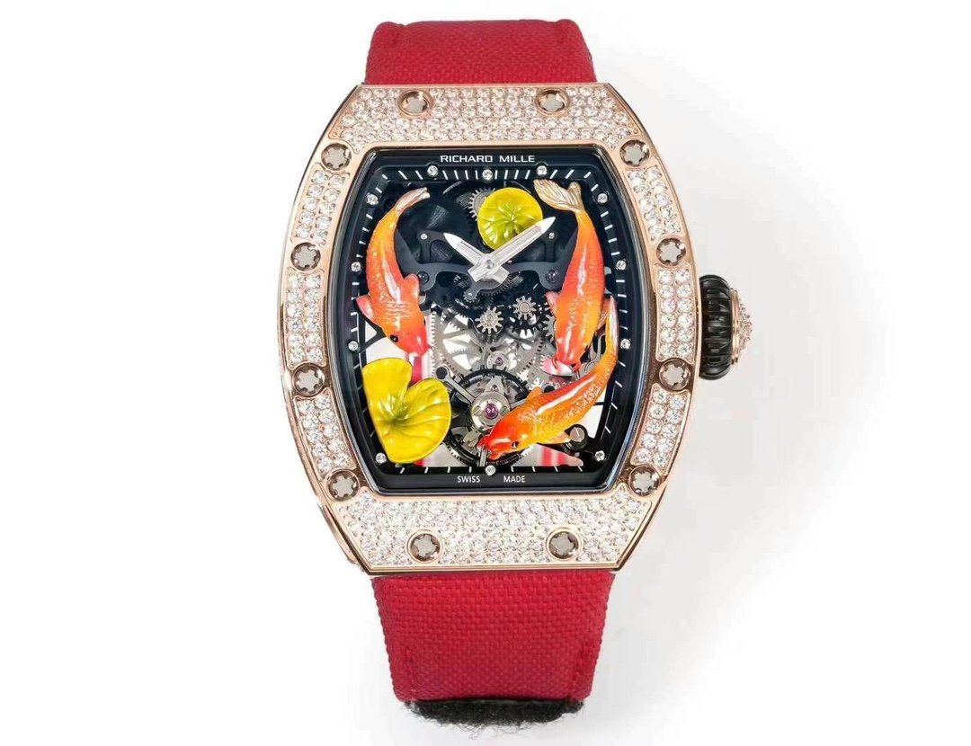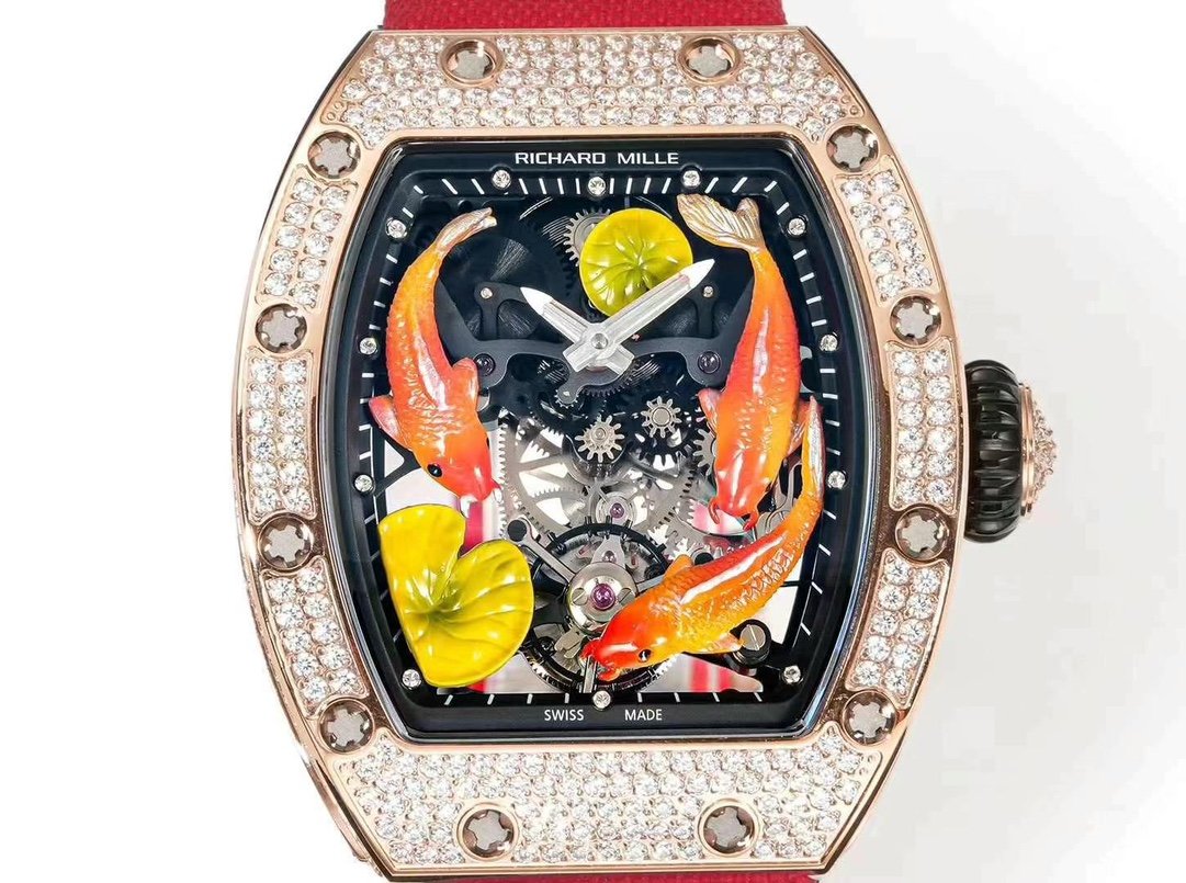 The RICHARD MILLE RM S10 Koi Tourbillon Watch is distinguished by excellent craftsmanship and cultural wealth, realizing the legendary Koi carp of the Oriental world on the face of the watch. The lively spectacle of Koi gracefully swimming in a pond is embellished with red gold and diamond-encrusted highlights, providing breathtaking beauty. This exclusive edition of the tourbillon watch, featuring a red Koi design, is the only model of its kind to be launched in China, making it an absolute collector’s treasure. With three meticulously crafted and lifelike Koi fish swimming in this mechanical pond, the combination of the tourbillon and Koi is believed to bring luck and fortune—making it a favorite among Chinese watch enthusiasts.