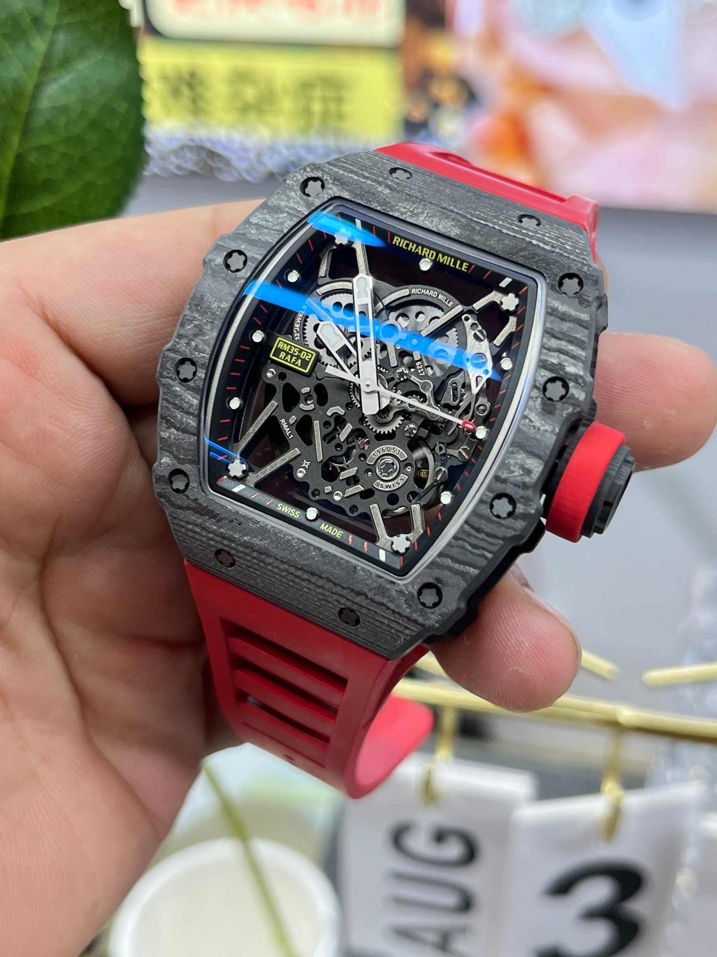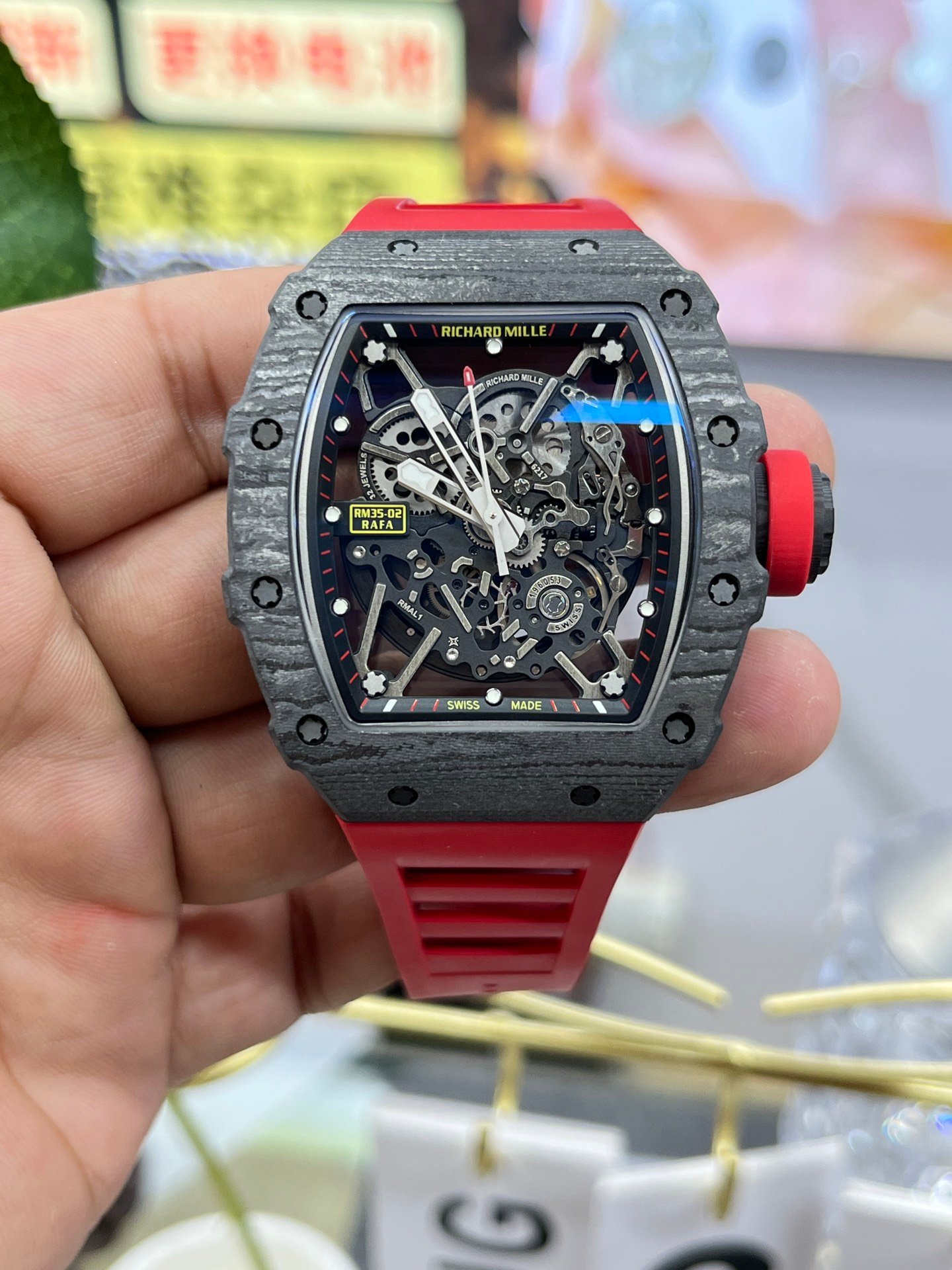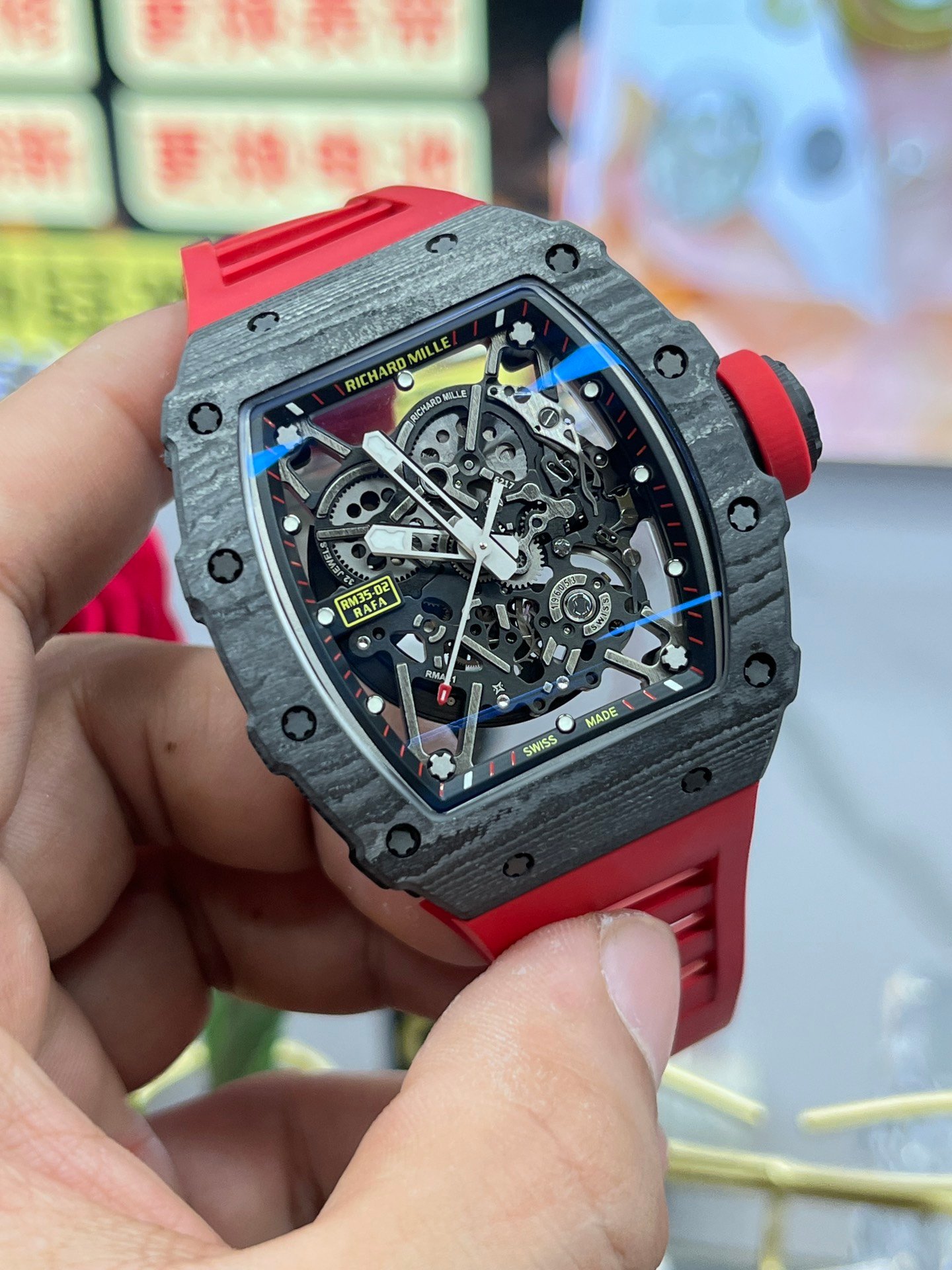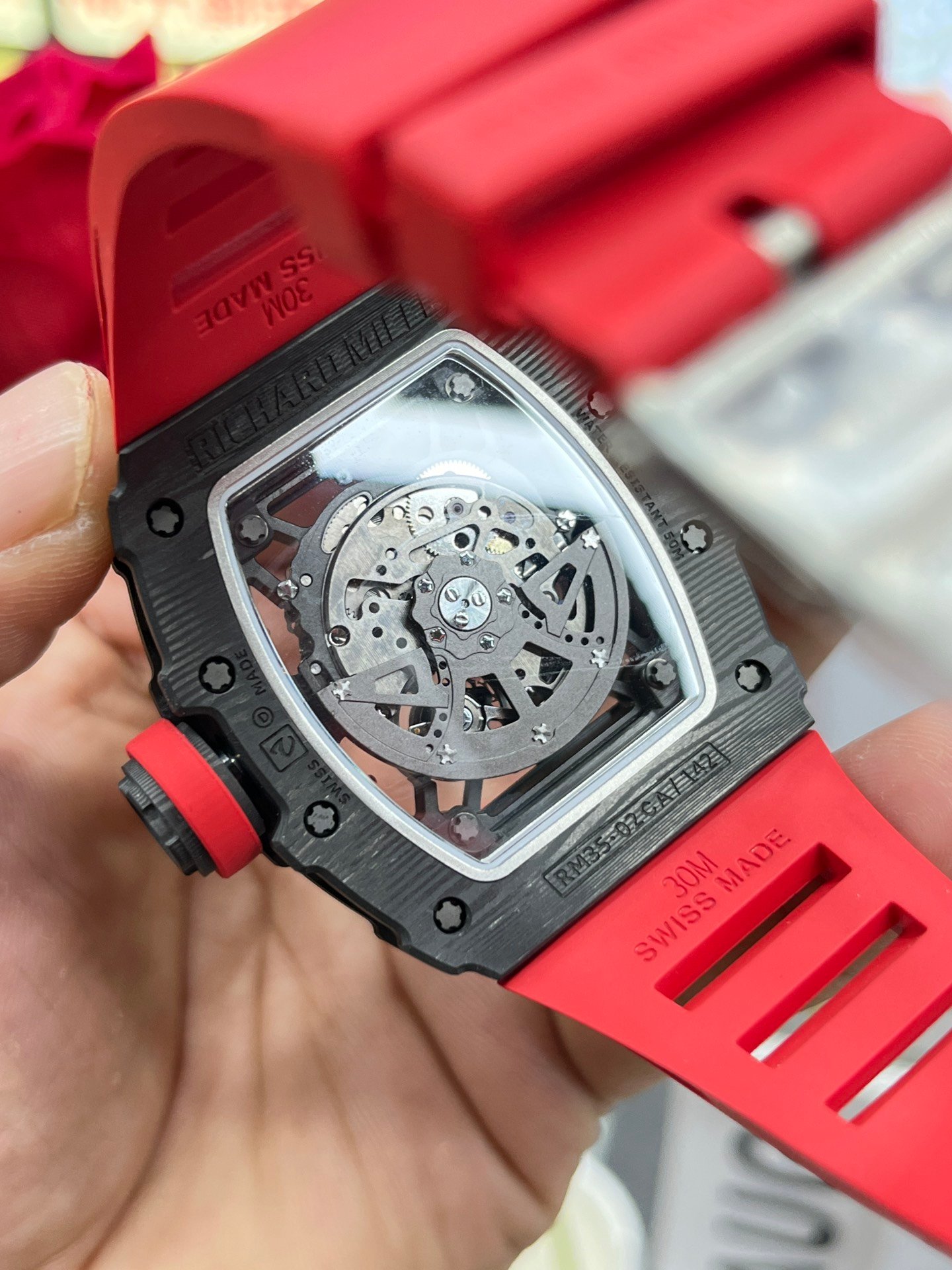 Replica Richard Mille RM35-02 Red Rubber Strap Swiss Movement Sports Watch — Premium 1:1 super clone. Case: Titanium / carbon composite tonneau case. Crystal: Genuine sapphire crystal front and back. Movement: Clone RM caliber (skeletonized automatic). 12-month movement warranty. Free worldwide shipping on orders over $1,200.