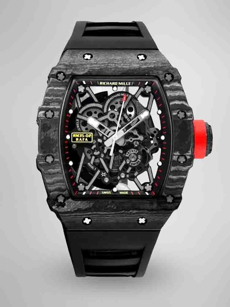 Richard Mille 35-02 Rafael Nadal Black NTPT Carbon Watch — Premium 1:1 super clone. Case: Titanium / carbon composite tonneau case. Crystal: Genuine sapphire crystal front and back. Movement: Clone RM caliber (skeletonized automatic). 12-month movement warranty. Free worldwide shipping on orders over $1,200.