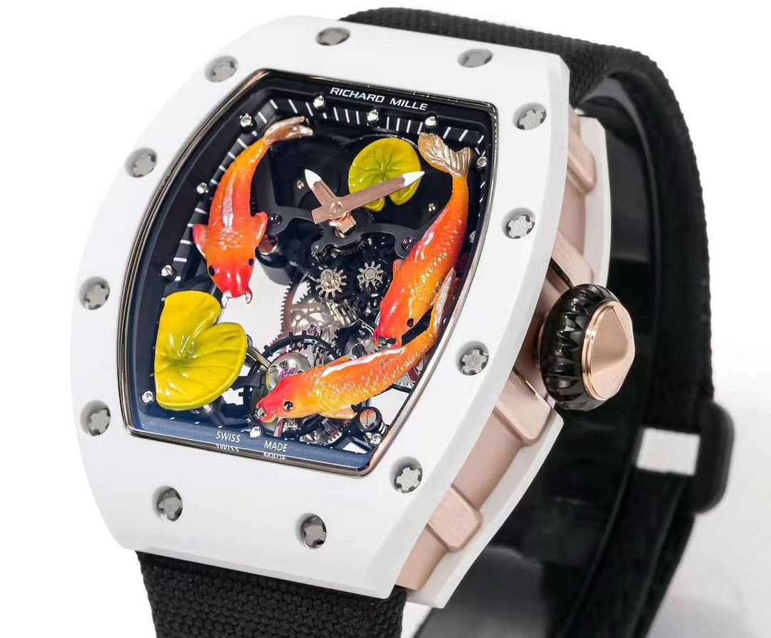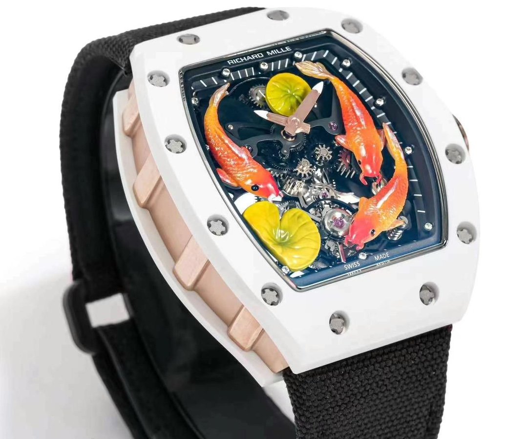 Richard Mille Replica RM S10 Koi Tourbillon Watch with White Ceramic Case — Premium 1:1 super clone. Case: Titanium / carbon composite tonneau case. Crystal: Genuine sapphire crystal front and back. Movement: Clone RM caliber (skeletonized automatic). 12-month movement warranty. Free worldwide shipping on orders over $1,200.