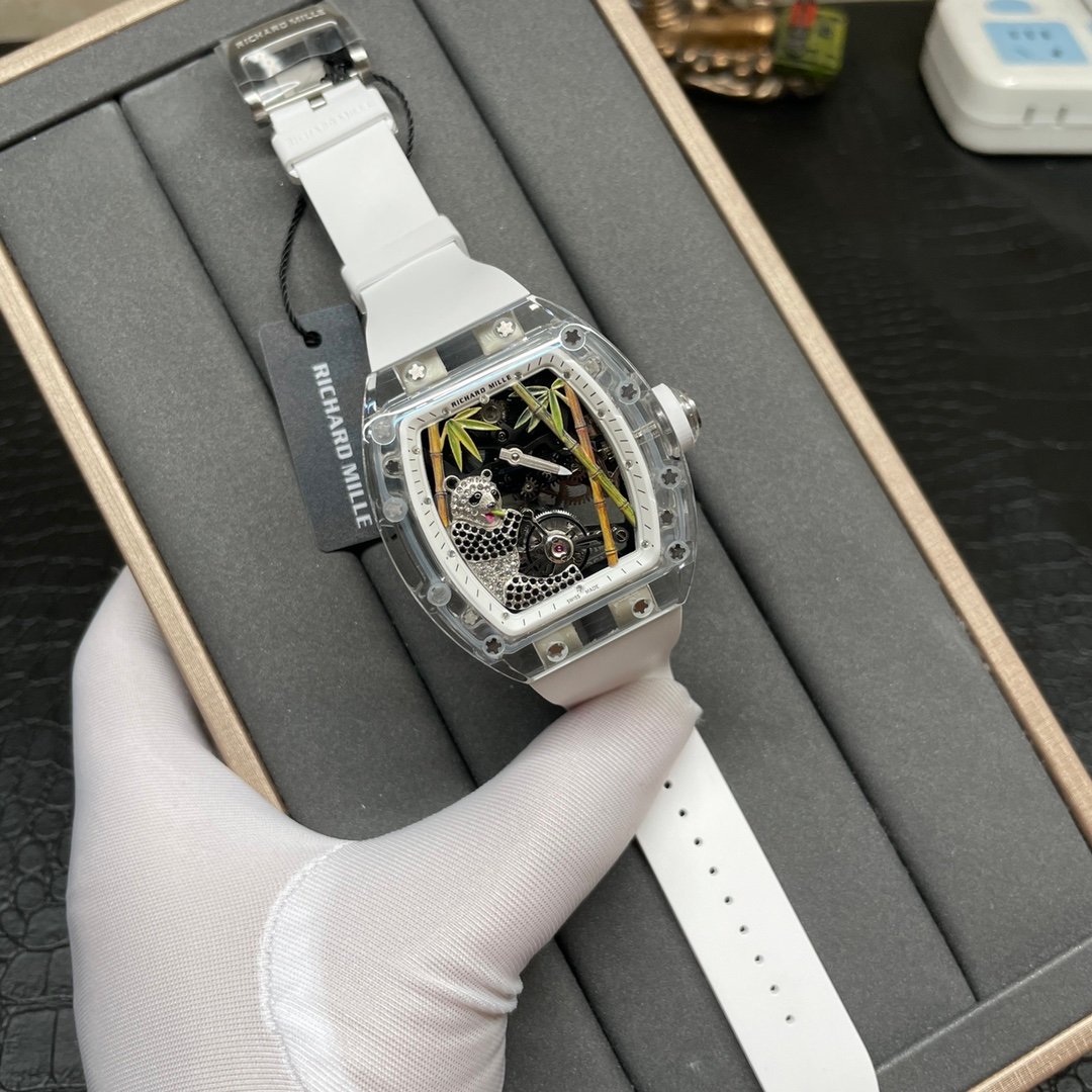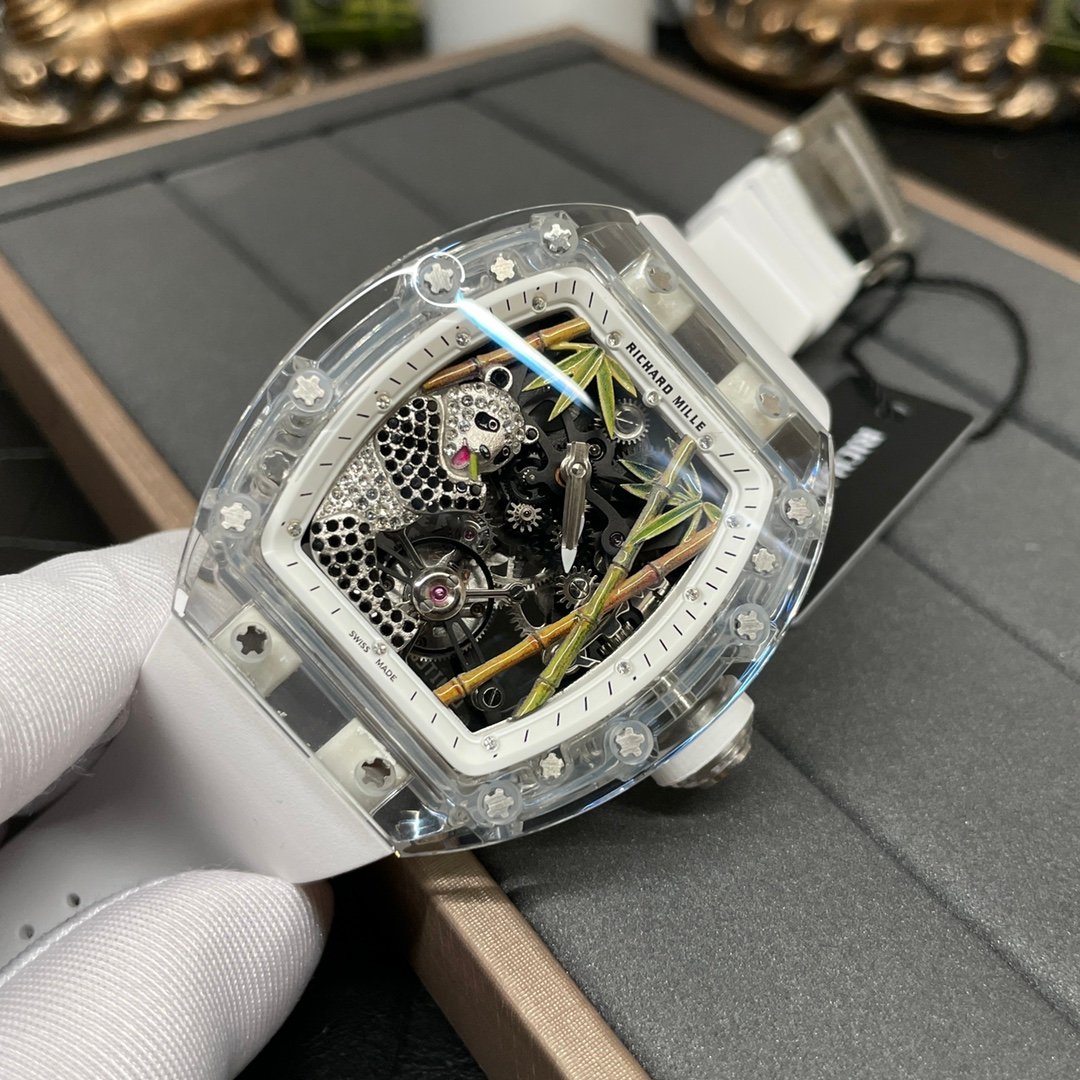 The Richard Mille RM 26-01 replica is a work of art that combines Swiss watchmaking know-how with the artistry of craftsmanship. With a diameter of around 50mm, this luxury timepiece exudes an air of regality with its breath-taking transparent sapphire crystal case, exposing its inner-workings. The dial is a stunning panorama where a panda rests on the bottom left, surrounded by finely detailed bamboo sticks flowing from the bottom right to the top, representing life and calm.