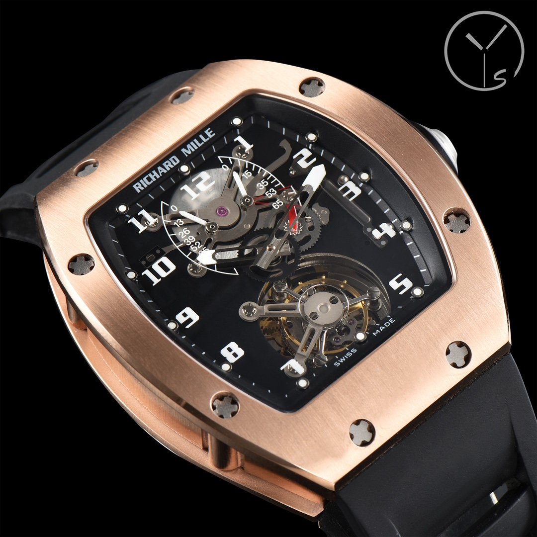 The Richard Mille RM001 Tourbillon is a remarkable replica of the original Richard Mille timepiece, offering exceptional craftsmanship and design. As the first-ever Richard Mille watch and the first true tourbillon replica in the market, it combines affordability with luxury. This model has been upgraded with a re-engineered deck structure that closely resembles the original, achieving a 95% similarity. It features a dual-layer tempered glass dial for a more authentic look, with enhanced clarity and finer details. The high-grade rubber strap is designed for maximum comfort, with a 3-hole breathable design that matches the original. Powered by a manual-wound tourbillon movement, this watch offers precise timekeeping and a 3-day power reserve. The case is crafted using advanced 5-axis CNC machining, giving it a flawless finish. With a sleek folding clasp and its striking tourbillon feature, this timepiece embodies the luxury and timeless appeal of Richard Mille’s design, making it an iconic choice for watch collectors.