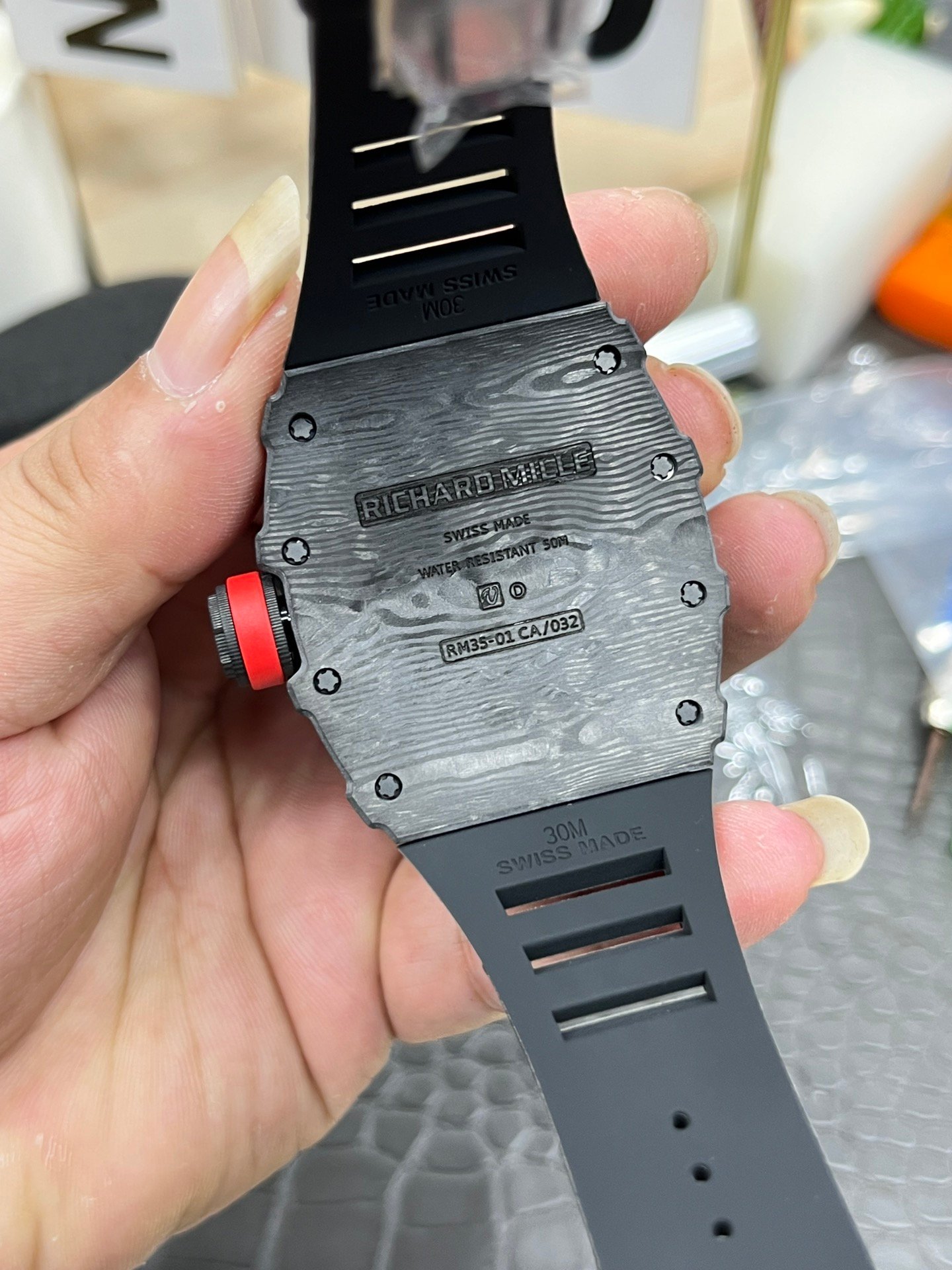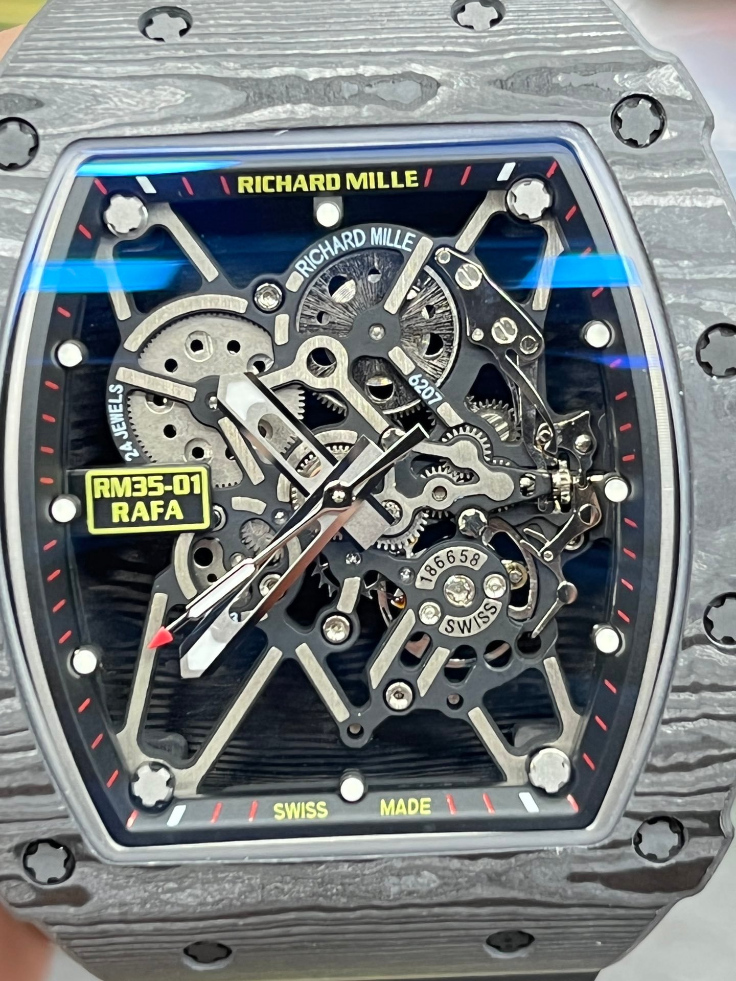 Richard Mille RM35-01 Super Clone Swiss Sports Watch, Carbon Fiber Case — Premium 1:1 super clone. Case: Titanium / carbon composite tonneau case. Crystal: Genuine sapphire crystal front and back. Movement: Clone RM caliber (skeletonized automatic). 12-month movement warranty. Free worldwide shipping on orders over $1,200.