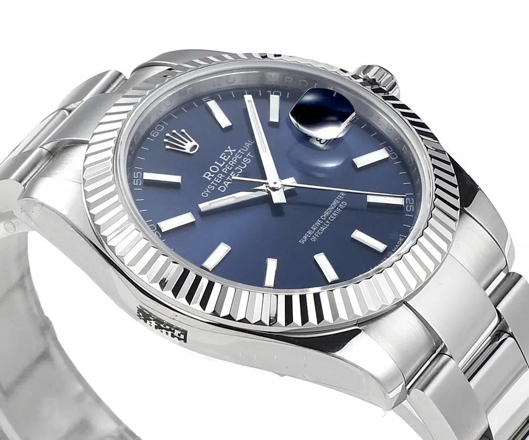 Rolex Datejust 41mm Blue Dial Stainless Steel Fluted Bezel with 3235 Movement — Premium 1:1 super clone. Case: 904L stainless steel case and bracelet. Crystal: Genuine sapphire crystal with AR coating. Movement: Clone Cal. 3235 (28,800 bph, 70hr power reserve). 12-month movement warranty. Free worldwide shipping on orders over $1,200.