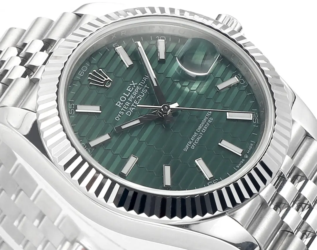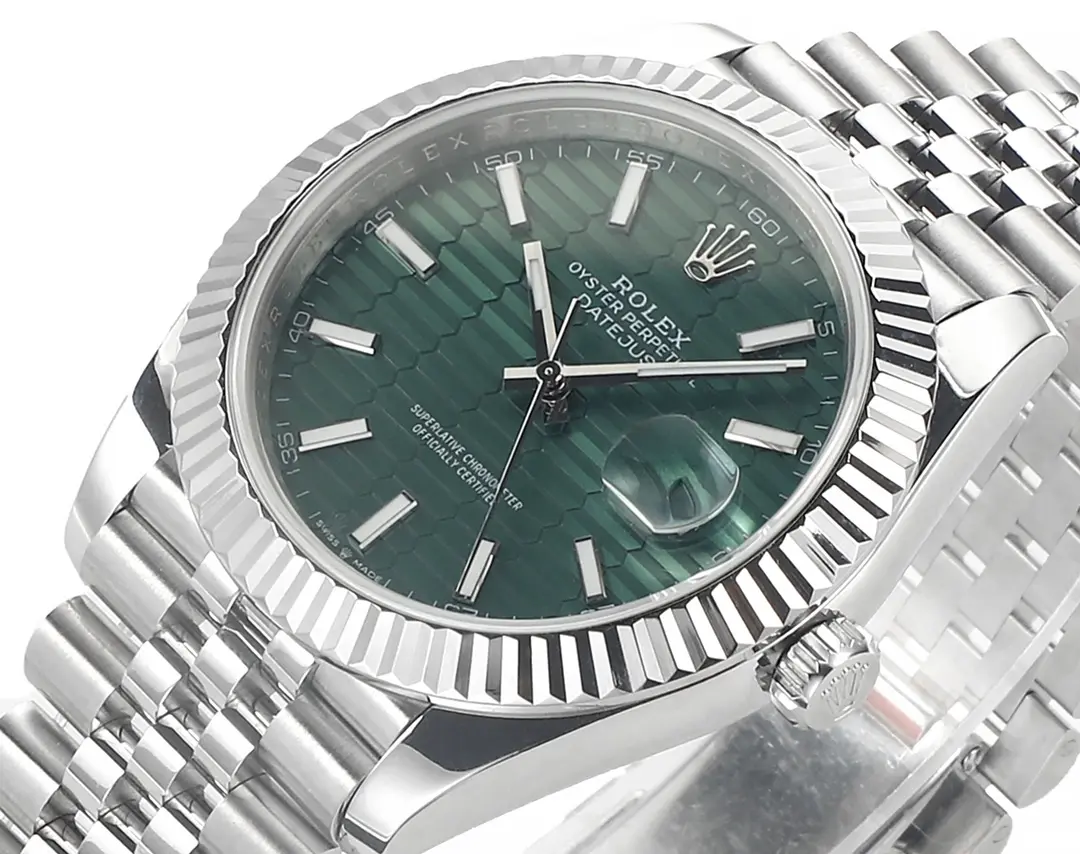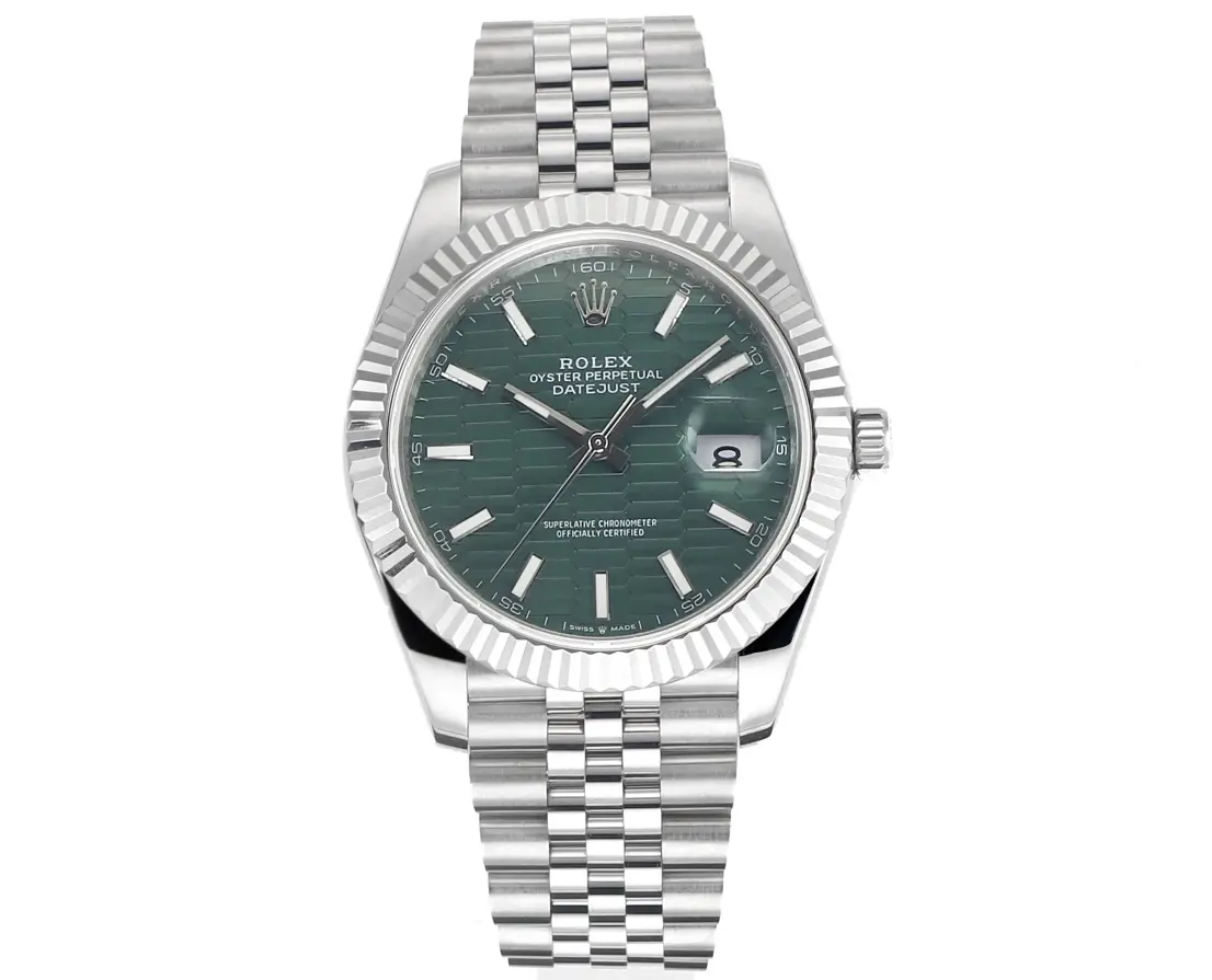 Rolex Datejust 41mm Green Dial Stainless Steel Oyster Bracelet — Premium 1:1 super clone. Case: 904L stainless steel case and bracelet. Crystal: Genuine sapphire crystal with AR coating. Movement: Clone Cal. 3235 (28,800 bph, 70hr power reserve). 12-month movement warranty. Free worldwide shipping on orders over $1,200.