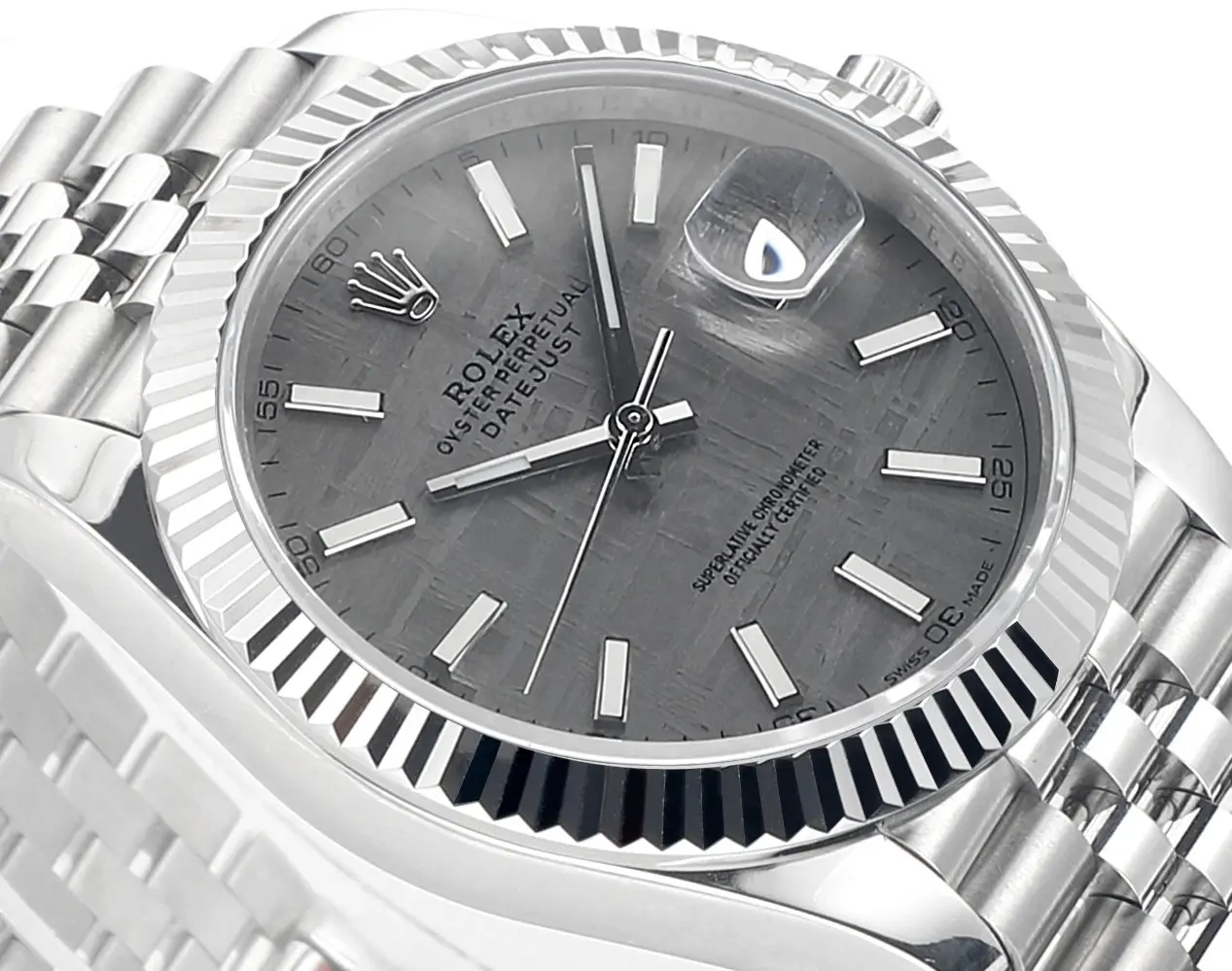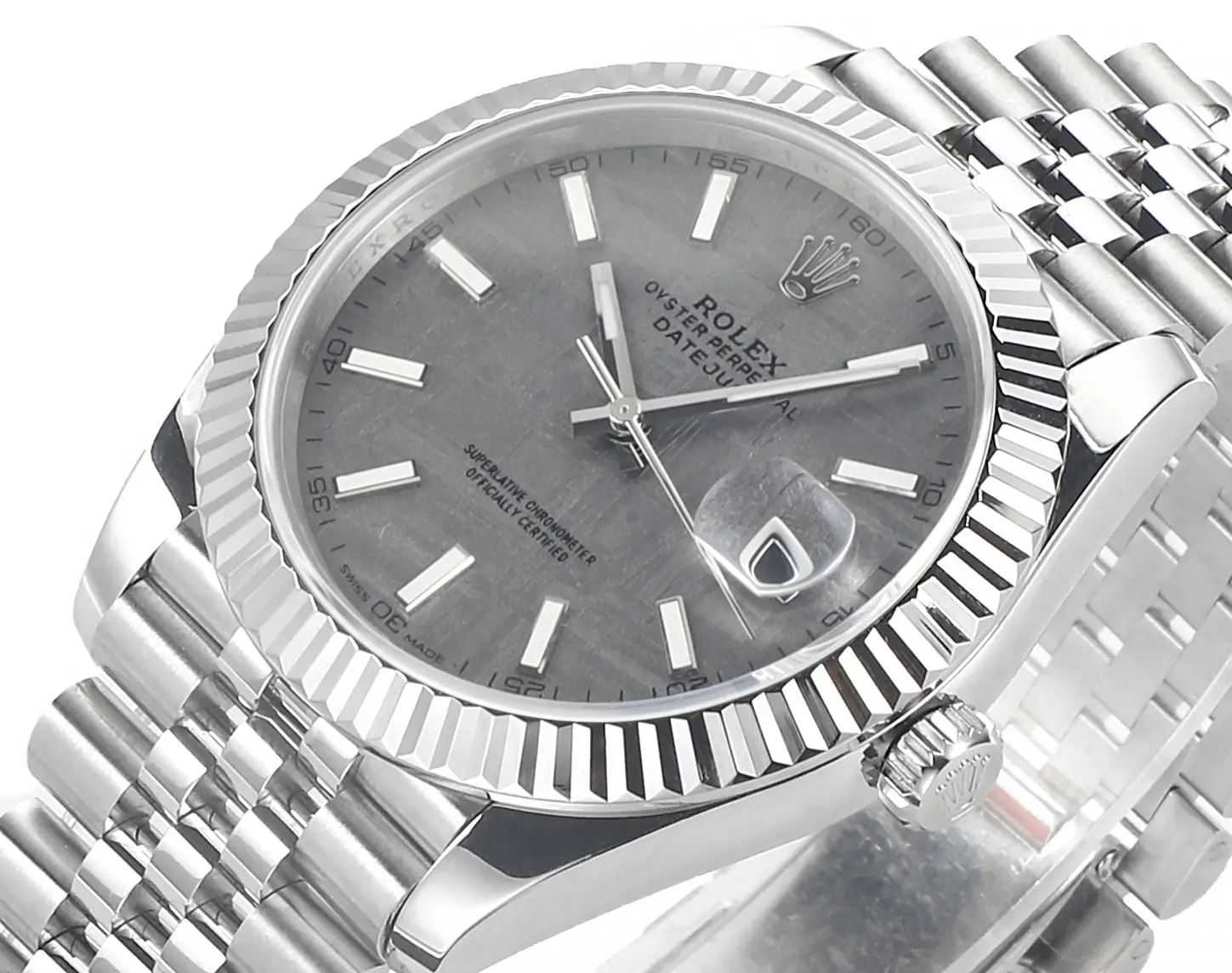 Rolex Datejust 41mm Meteorite Dial Stainless Steel Watch – Silver — Premium 1:1 super clone. Case: 904L stainless steel case and bracelet. Crystal: Genuine sapphire crystal with AR coating. Movement: Clone Cal. 3235 (28,800 bph, 70hr power reserve). 12-month movement warranty. Free worldwide shipping on orders over $1,200.