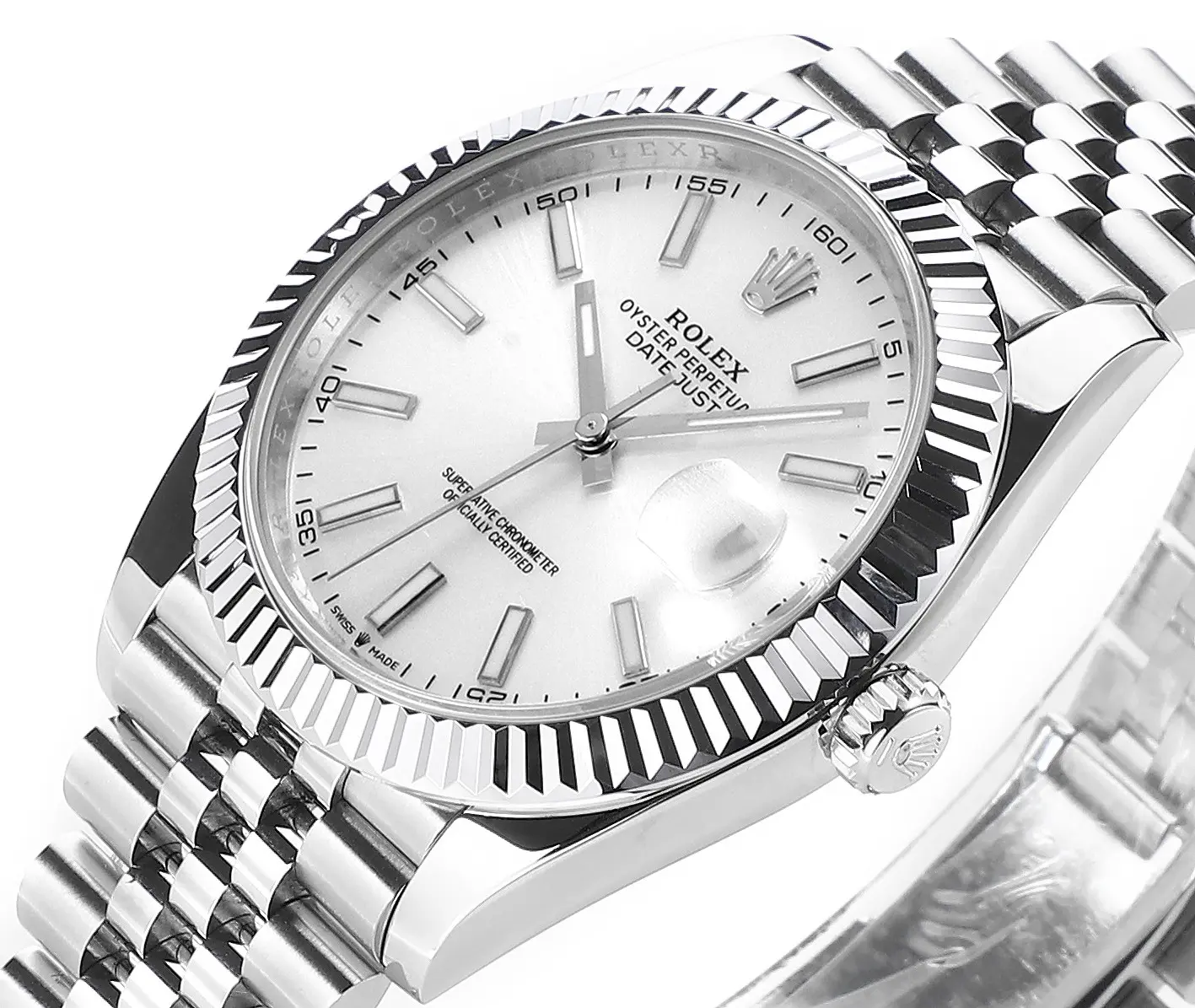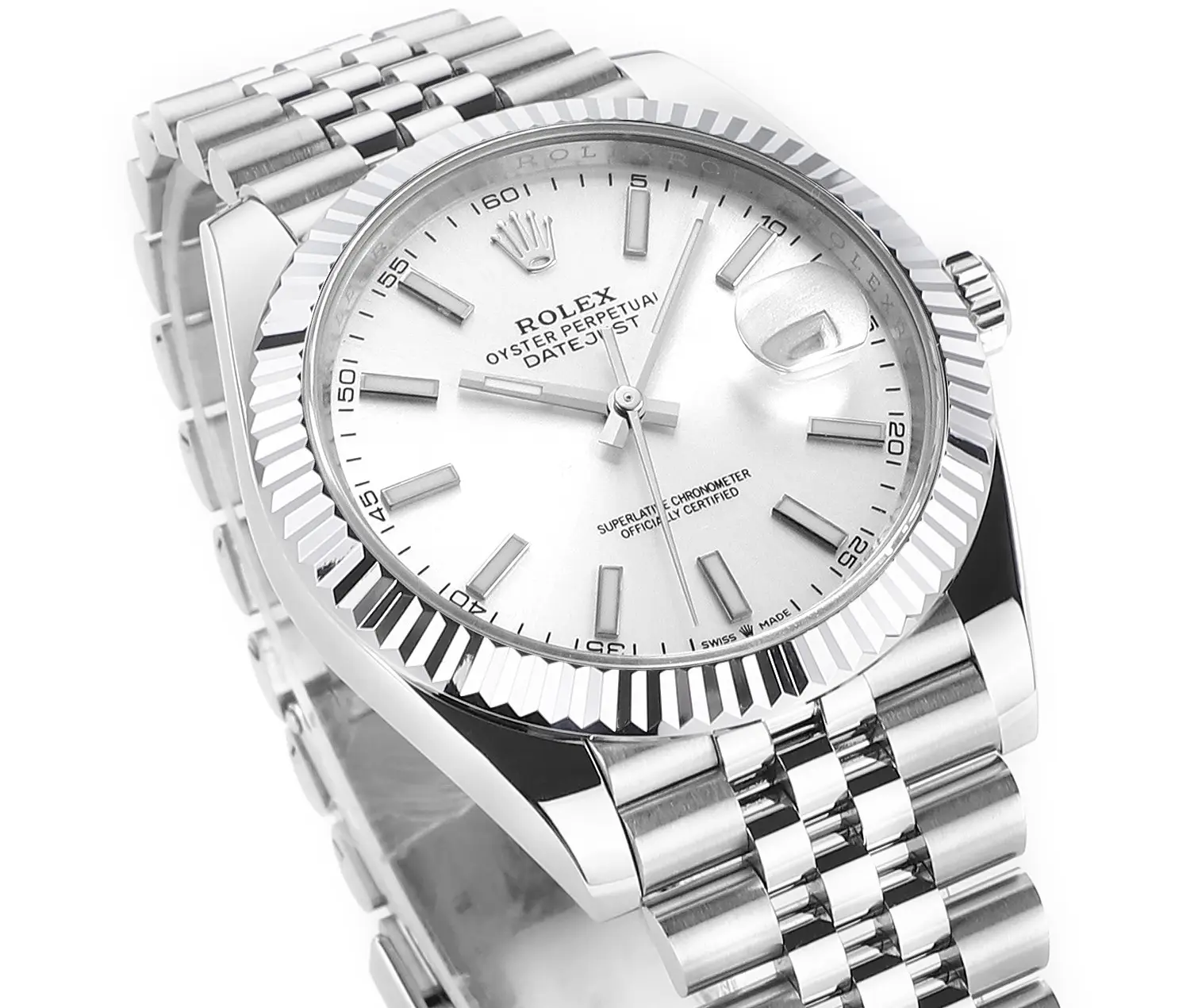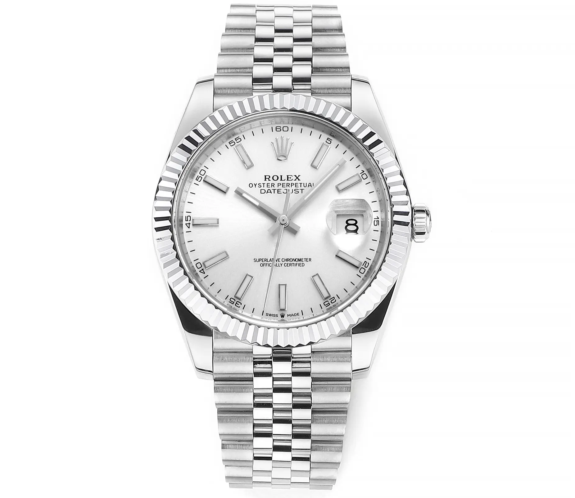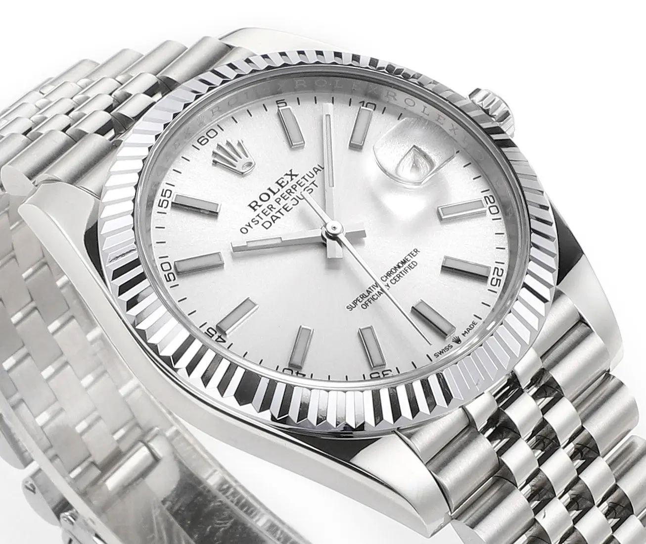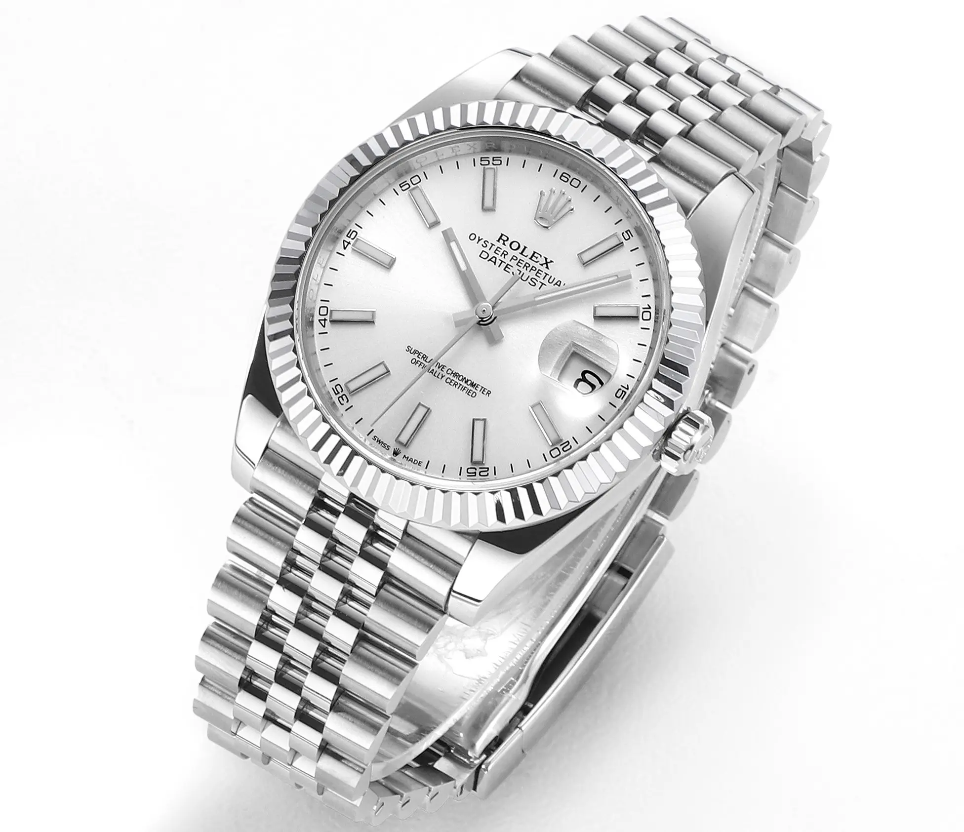 Rolex Datejust 41mm Silver Fluted Bezel Stainless Steel — Premium 1:1 super clone. Case: 904L stainless steel case and bracelet. Crystal: Genuine sapphire crystal with AR coating. Movement: Clone Cal. 3235 (28,800 bph, 70hr power reserve). 12-month movement warranty. Free worldwide shipping on orders over $1,200.