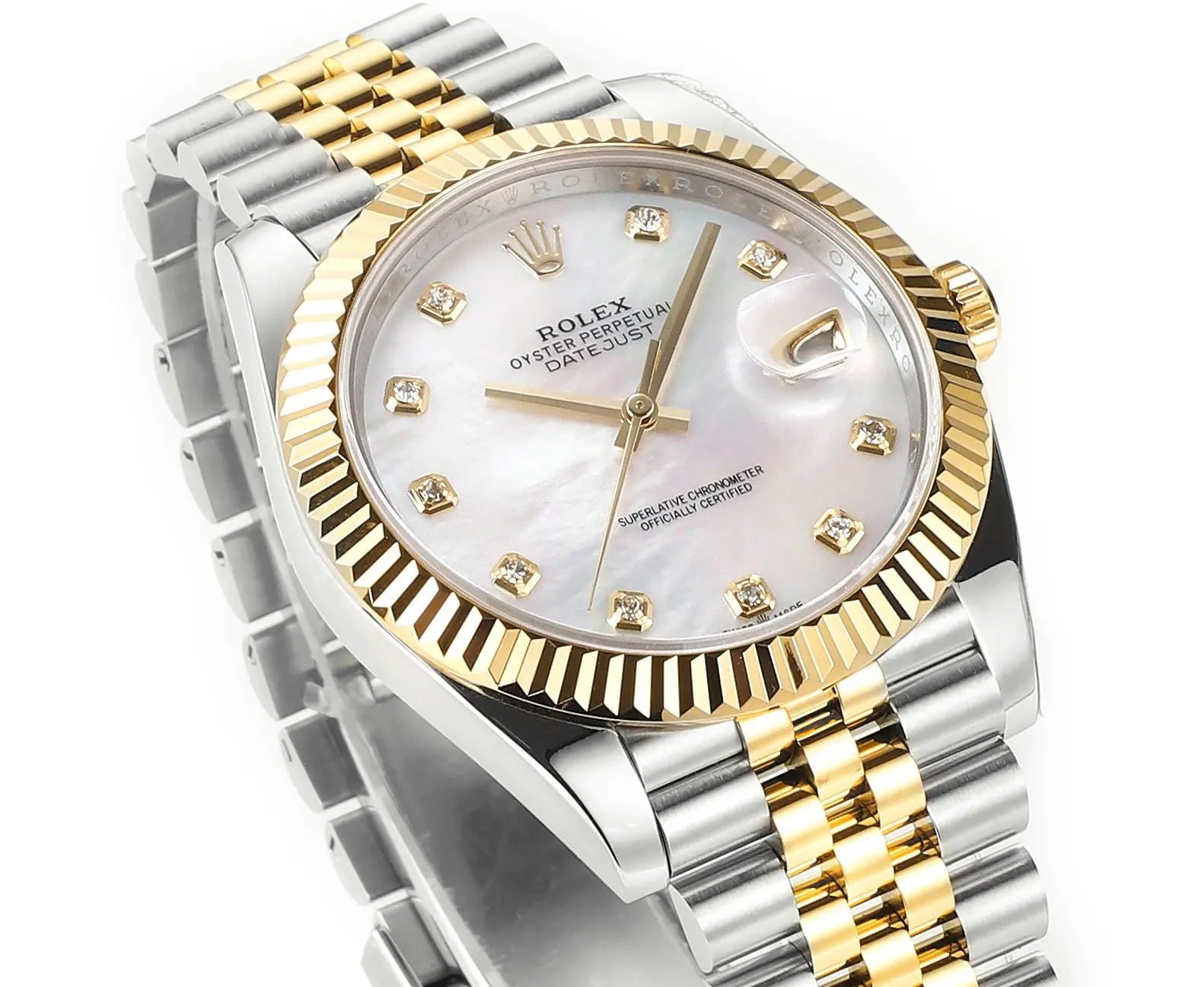 Rolex Datejust 41mm Two-Tone Gold and Steel Watch with Diamond Bezel — Premium 1:1 super clone. Case: 904L stainless steel case and bracelet. Crystal: Genuine sapphire crystal with AR coating. Movement: Clone Cal. 3235 (28,800 bph, 70hr power reserve). 12-month movement warranty. Free worldwide shipping on orders over $1,200.