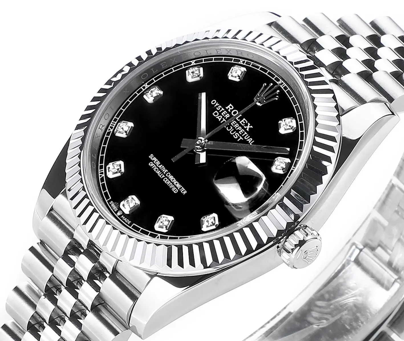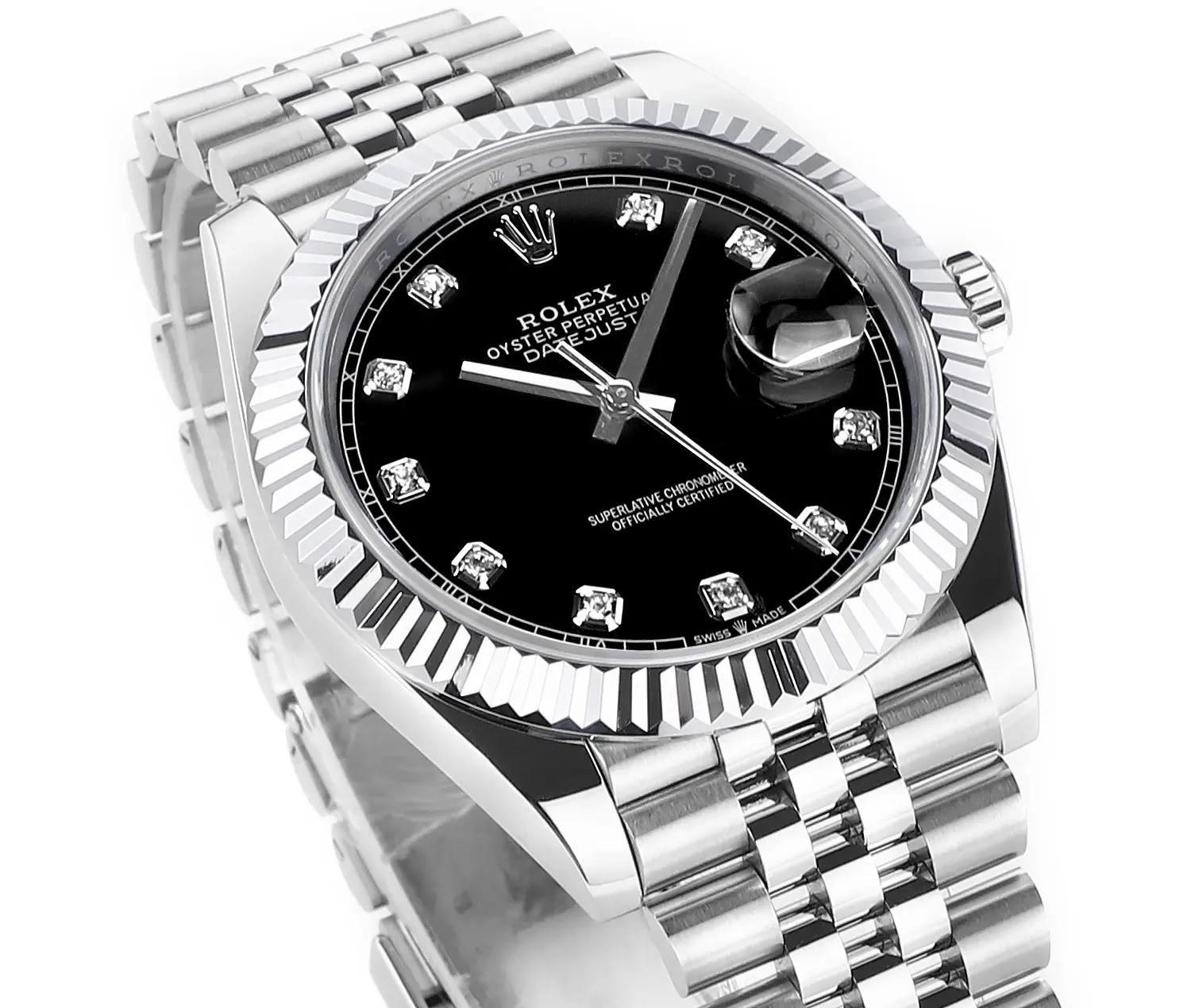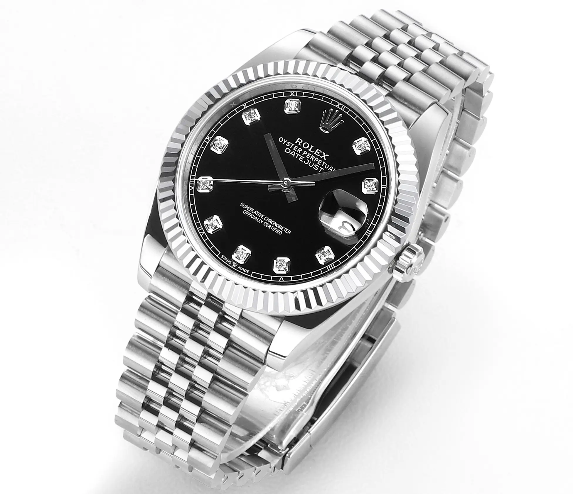 Rolex Datejust 41mm Watch – Silver with Black Dial, Diamond Markers — Premium 1:1 super clone. Case: 904L stainless steel case and bracelet. Crystal: Genuine sapphire crystal with AR coating. Movement: Clone Cal. 3235 (28,800 bph, 70hr power reserve). 12-month movement warranty. Free worldwide shipping on orders over $1,200.