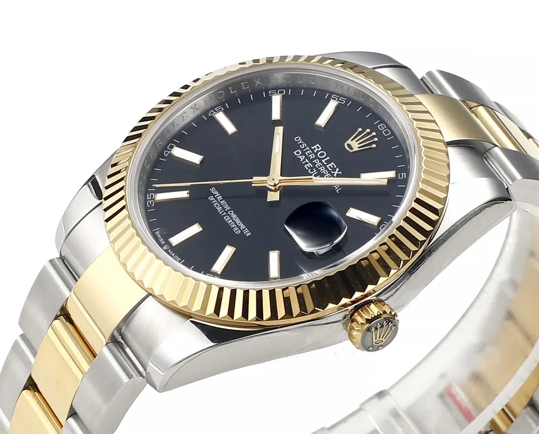 Rolex Datejust Two-Tone Black Dial with 3235 Movement — Premium 1:1 super clone. Case: 904L stainless steel case and bracelet. Crystal: Genuine sapphire crystal with AR coating. Movement: Clone Cal. 3235 (28,800 bph, 70hr power reserve). 12-month movement warranty. Free worldwide shipping on orders over $1,200.