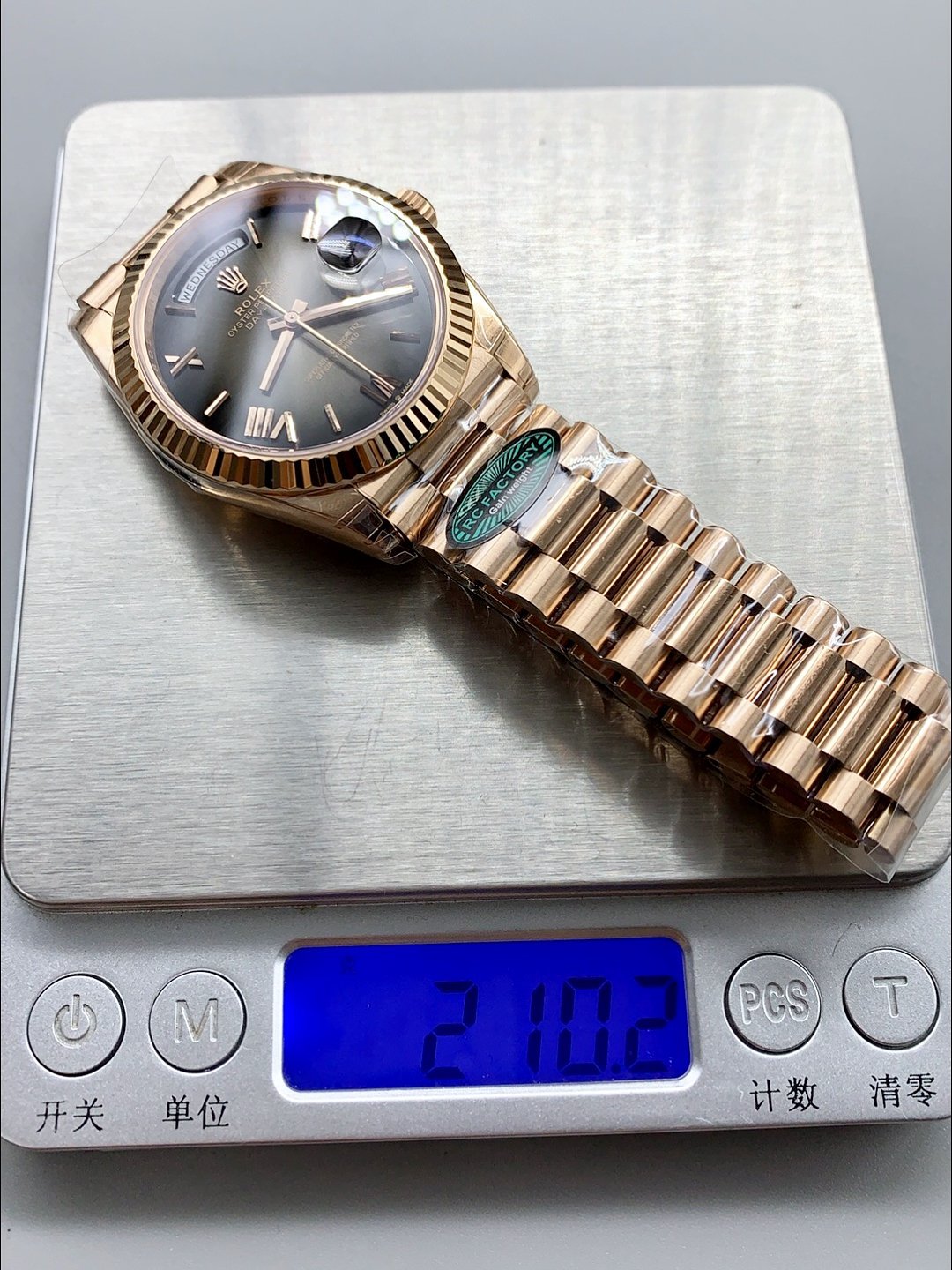 Weight-balanced DD – Ceiling-level “Rolex DD Day-Date” PPM. The bracelet color, dial color, watch weight, and thickness are all based on genuine original molds, redefining the weight-balanced version of the DD replica. The bracelet contains ceramic tubes, interchangeable with the genuine product. This is not a compromise replica, but a complete超越 (transcendence) in materials and craftsmanship! Rejecting “market common goods,” every gram of weight (precisely 209g-212g) and every millimeter of thickness fights for the dignity of the original.