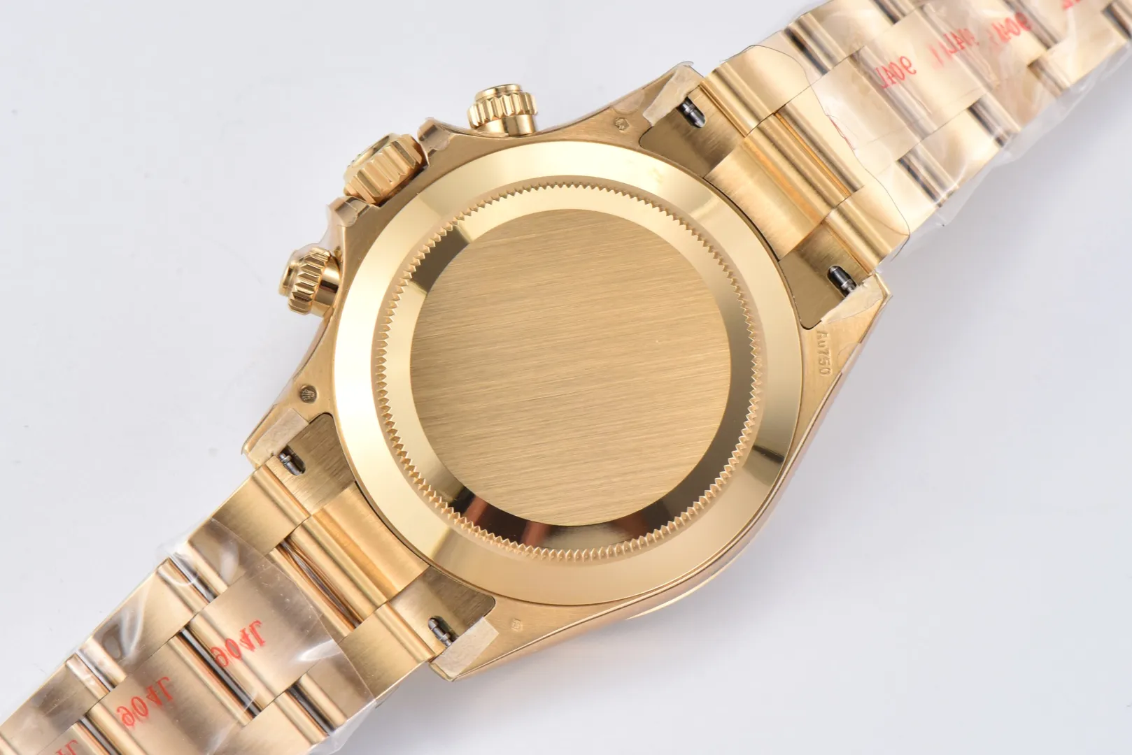 Rolex Daytona 116508 Green Gold Full Gold — Premium 1:1 super clone. Case: 904L stainless steel case and bracelet. Crystal: Genuine sapphire crystal with AR coating. Movement: Clone Cal. 4130 (column-wheel flyback chronograph). 12-month movement warranty. Free worldwide shipping on orders over $1,200.
